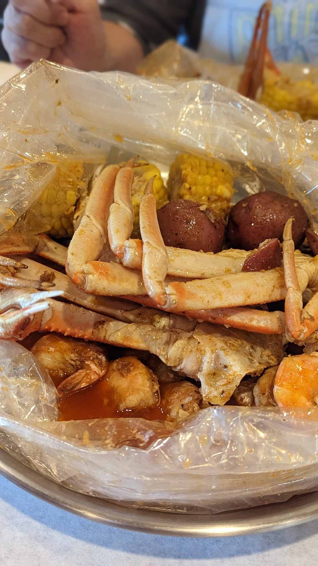 Read moreAway celebrating our 18th anniversary, honey & I stop in as we are Creole boil connoisseur's. We were quickly greeted/seated. The waiter was energetic; charismatic; eager to please & on point with suggestions. The place was huge and very clean. Atmosphere was pleasant. As a courtesy, they start you with two pieces of seafood breadstix. They were out of this world! And the crab meat was 100% crab. Honey & I shared a #4 ( 1lb. crawfish; 1lb. snow crablegs; 1/2 lb. sausage; 1lb. Shrimp; 8 baby potatoes and 8 small corn on the Cobb. (SO GLAD WE DID NOT ORDER TWO). Cause we left with a half bag. Normally at most seafood boil joints we would have to pay extra for the sausage; the extra 3 corn/potato's. Honey had hush puppies for his appetizer. He loved them, not the dipping sauce. My appetizer was gumbo & 6 raw oysters. The oysters was served with Tabasco; horse radish; lemons & crackers. Oysters, so good. The gumbo was a 3 out of 5. The right ingredients, right kick, didn't cook the roux long enough. And the consistancy was too liquidity, should be more consistency. I had a hurricane Jay cocktail, delicious! Great job on the alcohol ratio. ;-) Now, the boil... They had six levels of hot. The chosen spice level was hot w/ Cajun butter. That level was great for the honey. The waiter was observant enough to recommend I have him bring me a bowl on the side for the next level (very hot). That was perfect for me. I like my food with lots of flavor & a bit of a bit. But not so hot that you can't enjoy it. The food was cooked to perfection The seasoning .. O.M.G DELICIOUS! Yes, I will be revisiting... Yes I recommended all to try it out. You will not be...
