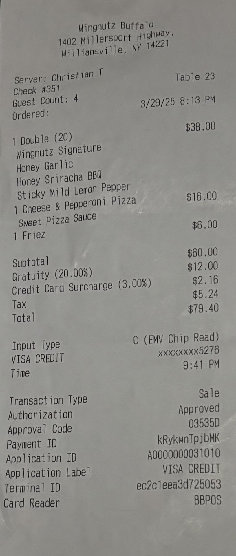 Read moreGreat food, but do not dine in for a game night. We went for a Bills game night, and figured it would be packed, and didn't think we would get seated right away without a wait. To our surprise, we were able to be seated within 2 minutes of us arriving there, but it all went downhill from there. We were not waited on for at least 20 minutes, even though the other tables around us who were seated after us were waited on and were even served food, and when a waitress finally came over to take our order and even just grab us waters, she had said that we were "not assigned" when we were seated. That should have been the first red flag. She did warn us that due to the crowd there would be a longer than average food wait time, which we again expected due to the Bills game, but we did not expect this wait time to be over an hour when other tables were not only getting their first order but second and third orders. They seemed to prioritize the table behind us for some reason, and even mixed up some of the food orders that were supposed to be for other tables and gave it to them (including, we think, a couple of appetizers that we ordered). When our order finally did come, the food was incredible, easily some of the best pizza and wings in Buffalo, but our waitress forgot to bring us plates for the pizza, and never bothered to check in with us until we were able to call her over during a lull. By that point, we just wanted the tab and to get out of there. It was clear that they prioritized the larger party behind us as the owner/creator, managers, and several of the waitstaff came up to talk to them and serve them more and more food that they didn't even ask for, and it made us feel a little neglected. I recognize that a lot of this was not the fault of the waitstaff entirely, especially not the food wait time, but some of the forgetfulness or mixing up tables really got under our skin by the end of the night. All in all, I would absolutely come back on a night that it was not busy or take out some of their food to go as it is really really great quality, but I would never venture back in there on a Bills game night when there are other options that I know are more attentive to every customer, not just larger groups...
