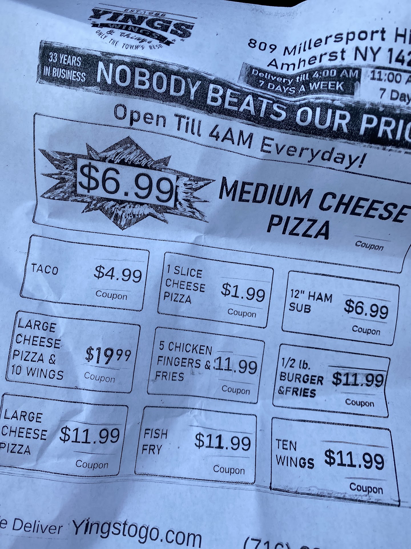 Read moreMy first time to yings.Delicious egg foo young.large servings.perfect pork fried dumplings.awesome pork fried rice.spring rolls delicious.im not really sure about the bad reviews but all I can say is wow! Delicious. Maybe good advice would be to try a few different things out over time and find out what you like the best.At any restaurant there's bound to be dishes that you don't like and some that you do. I would say don't just go there once go back again and try something different because my food was spectacular.I found Jim to be pleasant kind funny.We shard a few laughs.And who cares if they got a few things laying around like papers on the tables. It's a business they're trying to run and they're open late, be grateful.The pizza was awesome too by the way, I grabbed a slice couldn't believe how good it was.Ask for a little extra sauce on your pizza. All I can say is I had a perfect experience my first visit to yings and I will definitely be going back next week. I love the fact that they're open till 4:00 a.m. That's...