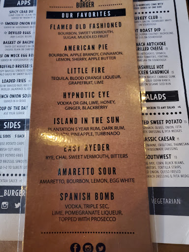 We arrived a couple minutes late for our reservation. The hostess seated us after a brief wait. Our table was in front of a wall of small lockers. We wondered what they were for. Well during our meal someone in the whiskey club showed up and had to get behind our table to get his liquor bottle out of his locker, kind of odd. We had the hushpuppies and they were over done, if they were taken out of the fryer 60 to 90 seconds soon they would have been perfect. They were as dark as brownies.. For my 3 drinks I had 2 Spanish bombs and harvest moon, they were great, my wife had the necessary evil and liked it and the harvest moon as well. She had the weck burger and even though the roll was twice the size of the burger she enjoyed it, I had the Nashville chicken sandwich and it was tasty. I asked for a side of the spicy BBQ sauce and it sure is spicy and good too. When we got our hush puppies we asked for cutlery and it took 10 minutes to get it, the servers were friendly but the service was slow, each round of drinks took 10 minutes and after we were seated it took over 10 minutes for someone to come over to the table. It was ok here, not bad and not great, probably wont...