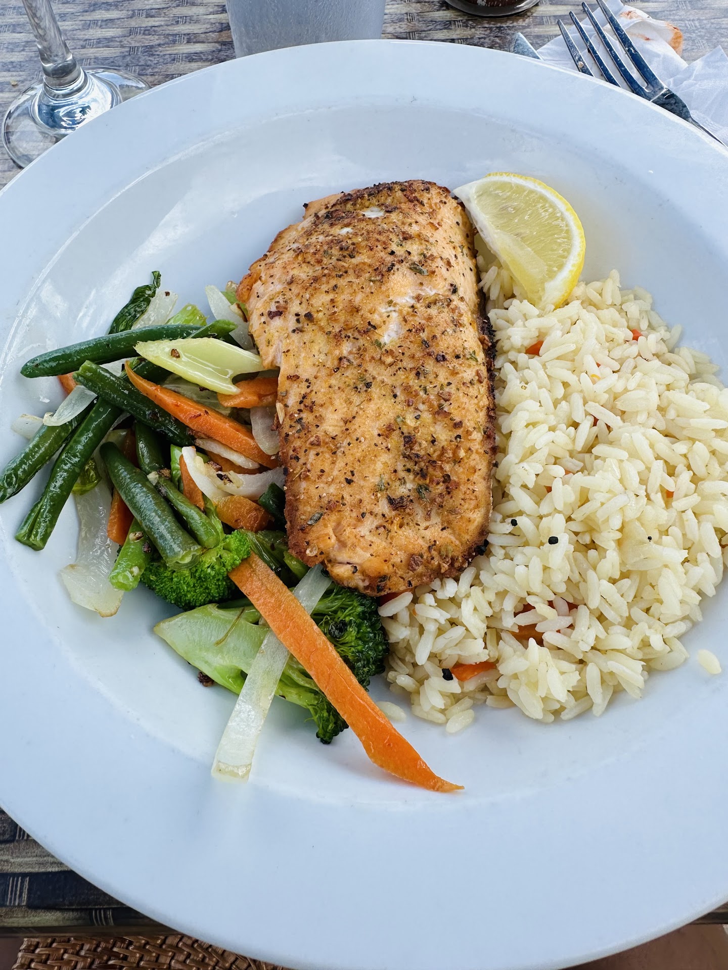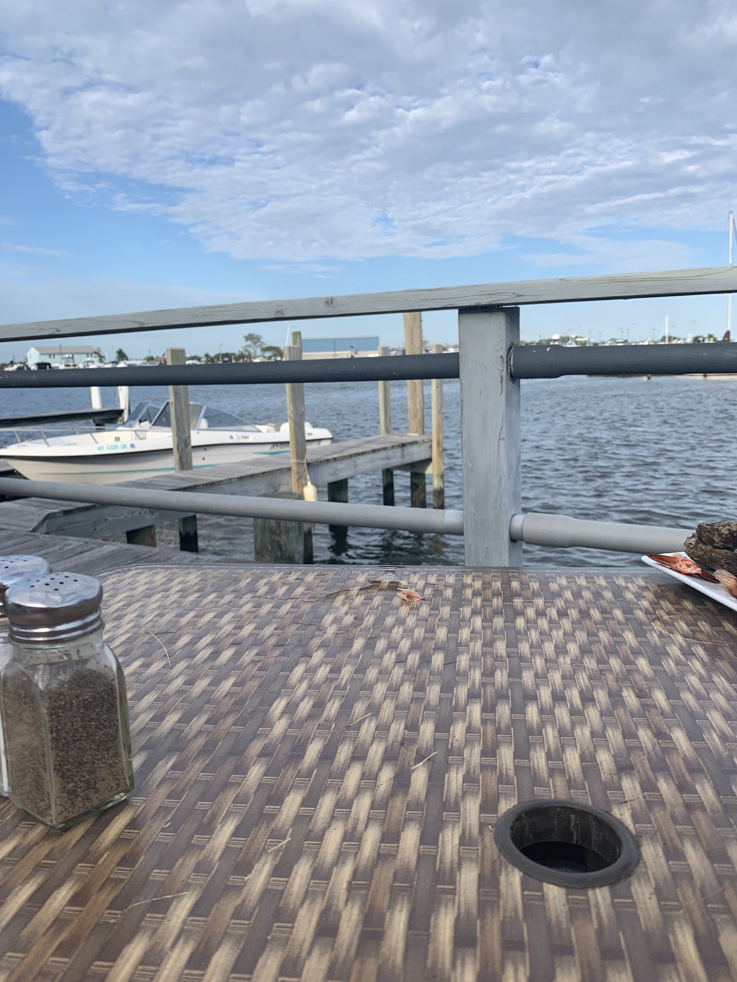 The view is perfect at this hot spot too--seated right on a pier if you choose outdoors, which we did both times. And we are not typically al fresco diners...we hate eating outside when it's very hot or humid, but we asked for a table in full shade and was accommodated. With the breeze off of the water it was perfect. You can also sit "semi outside" in a sun room that leads to the outdoor dining. You may sit fully inside the dining room or at the bar.
