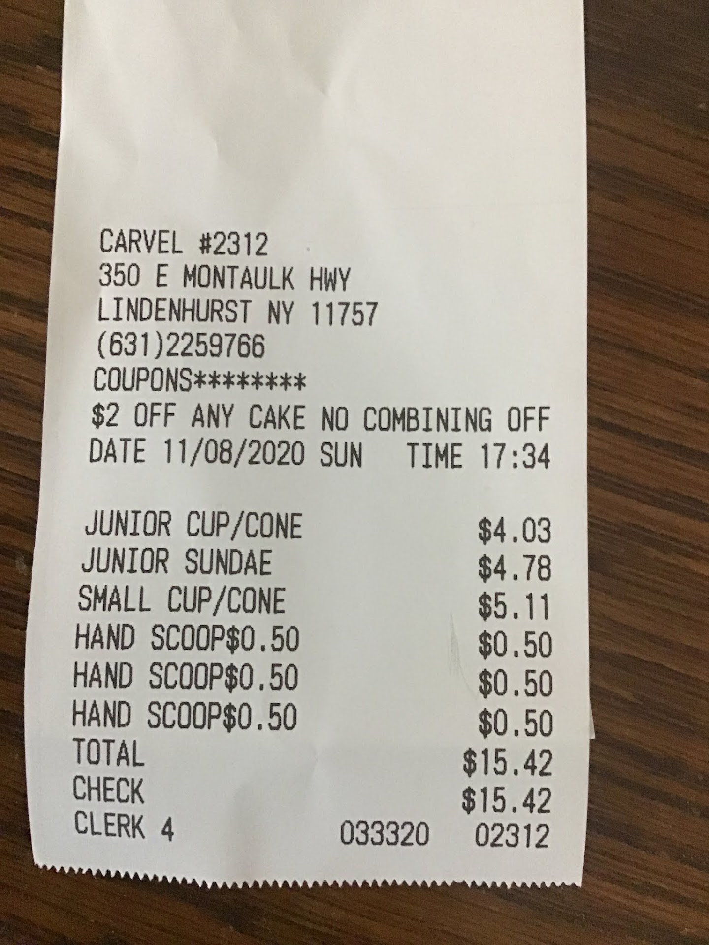 Read moreI use to go here all the time but tonight was terrible. I ordered two small sundaes and they put one scoop of ice cream in each of the containers which was barely half the containers. One was chocolate chip cookie dough and it was basically just vanilla ice cream. I swear it literally only had a singular piece of cookie dough, probably the size of a dime, throughout all of it and barely any chocolate chips. Absolutely terrible experience and I drove out of my way to this particular carvel cause it use to be the best one. Definitely not going back to this one again. Extremely...