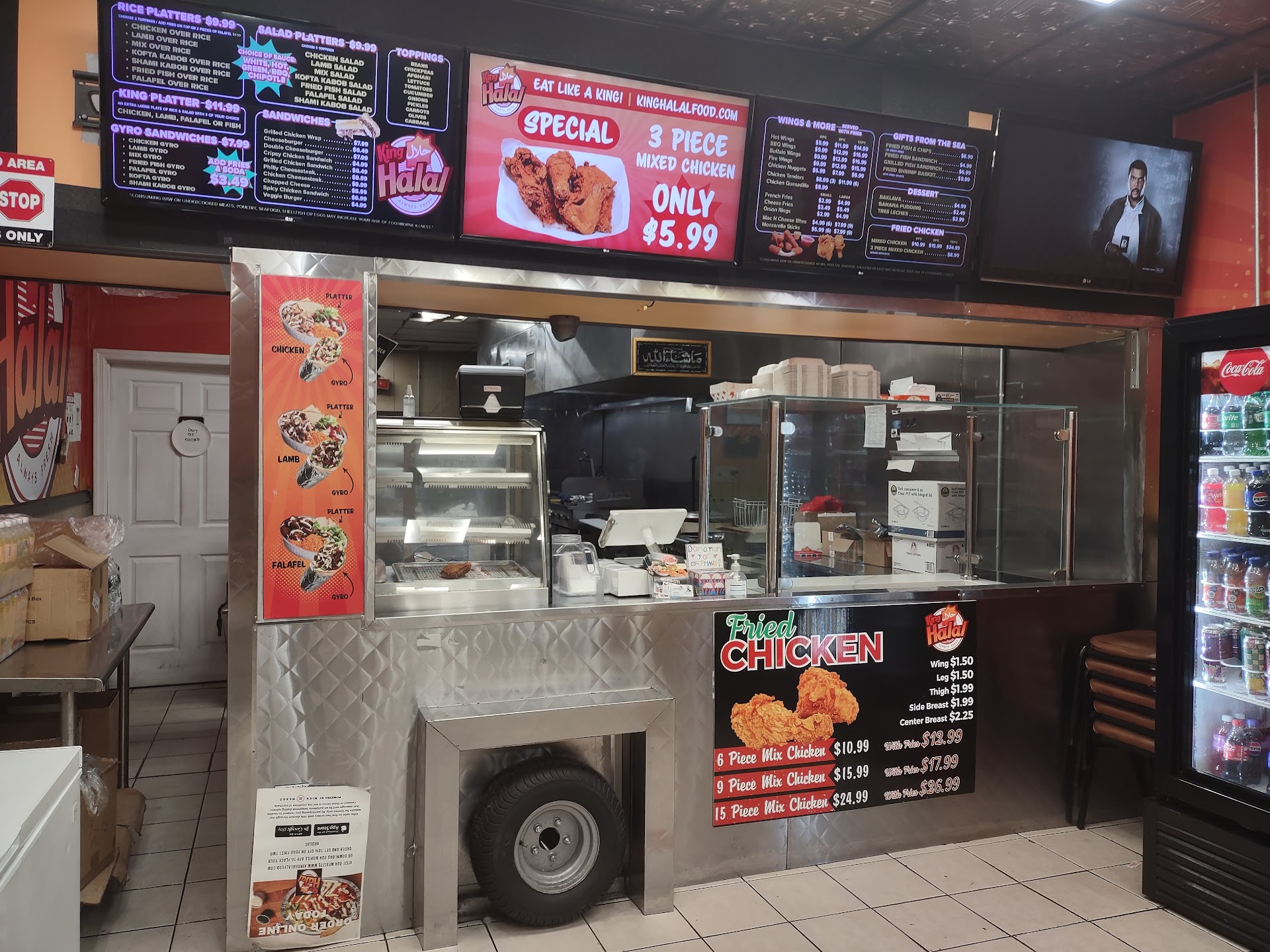 Read moreWas in the area on a late Sunday evening and this was one of few restaurants that was open late. Decided to stop by and try the food. The exterior was not very inviting with a dirty street/curb/sidewalk, poorly lit parking lot, and little street lighting too. The restaurant's interior was open, spacious, and bright (well lit). Restaurant's dining area had several tables and chairs available, but appeared to be a bit dirty and had some wear and tear. Young gentleman behind the counter was friendly, promptly greeted, and then professionally answered my questions regarding some menu options. Gave my order and waited, which was not a very long wait time too. While waiting, several customers (appeared to be regulars) were walking in and just picking up their preordered meals/food to go. I had the King platter with fish, falafel, and chicken over rice. Fried fish was ok, not greasy, not dry, and flavorful. Falafel tasted a bit dry and felt dense. The chicken was good and the white sauce, too...of course. Spicy crispy chicken sliders were actually better than expected, especially for the cost. Had good flavor, enough spice and heat, and filling. Overall an ok experience with very good service, but wouldn't go out of my way to get...