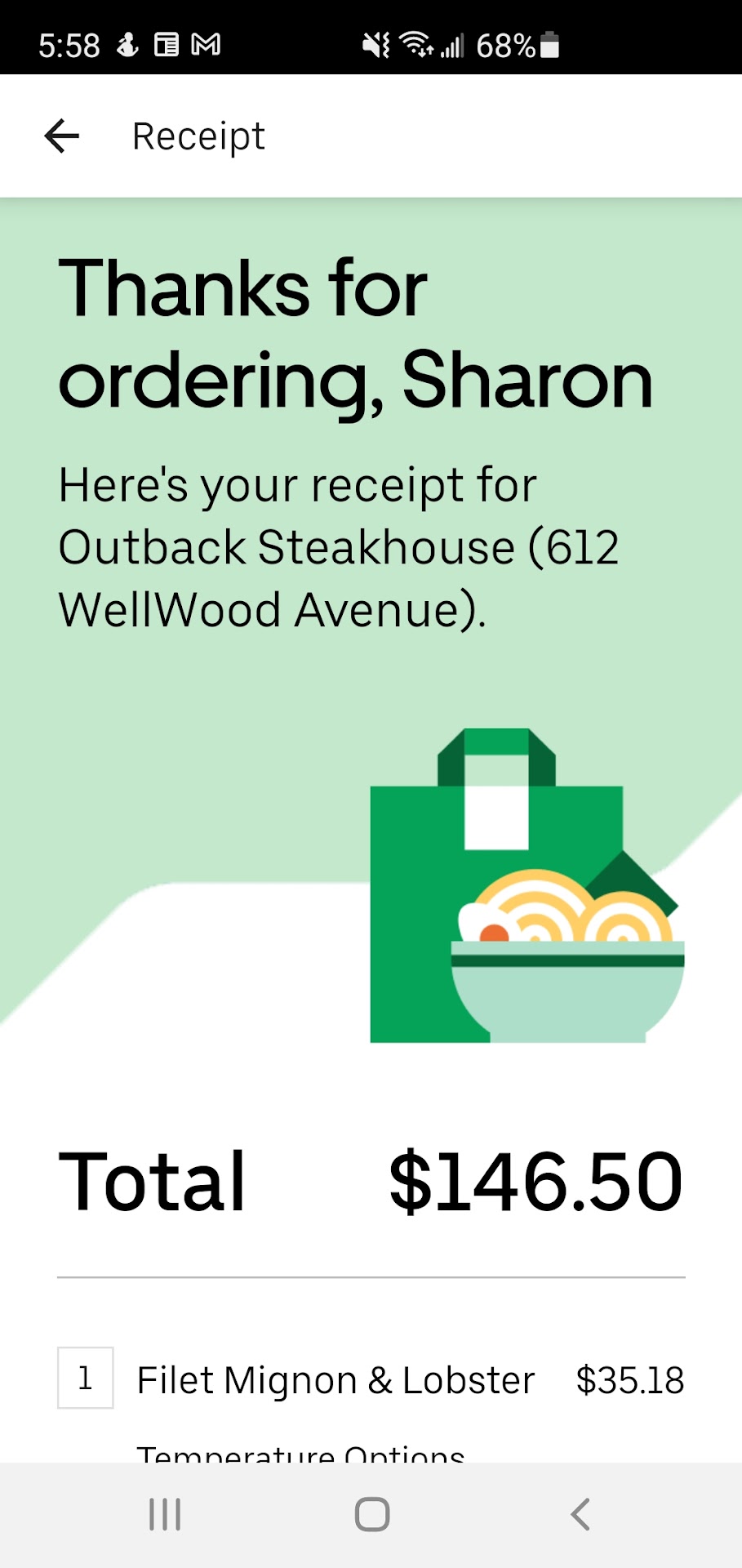 I have to say that I as well as my daughter and husband were quite disappointed in the food especially considering we spent $ 140 dollars. We all ordered the 6 oz filet mignon and lobster tail we each ordered different sides and my daughter ordered the Chocolate thunder from down under. Unfortunately all three filet mignon were quite dry and one had an excess amount of fat for a piece of meat that size. The lobster tails were severely overcooked and it tasted like they were frozen lobster tails that were heated in a microwave. I had the creamed spinach and Mac and cheese. The creamed spinach tasted really good but the Mac and cheese was dry and unseasoned. The best thing about the Mac and cheese was the noodles were not overcooked. My daughter had the Mac and cheese and loaded mashed potatoes. She too felt the Mac and cheese was dry and unseasoned. She did express that the loaded mashed potatoes were okay but. " Nothing to write home about". My husband had a salad and French fries. You can't do much wrong with a salad but the French fries looked like frozen ones. He hasn't ate yet but considering how high maintenance he is I am sure I am going to hear an earful on less than par food which I am totally in agreement it was. Finally my daughter's Chocolate thunder from down under had a delicious brownie and completely melted ice cream which Uber eats graciously compensated her by refunding some money. I only wish they could have compensated me for the entire disappointing meal less the few sides that were just okay. I am wondering if I had ordered this at the restaurant and dined there would it have been this horrific. I guess I will never know because after this I would never eat there again. Here we were my daughter and I trying to change things up and step out of our comfort zone. Shame on us we should have stuck with Red Lobster where we have never been...