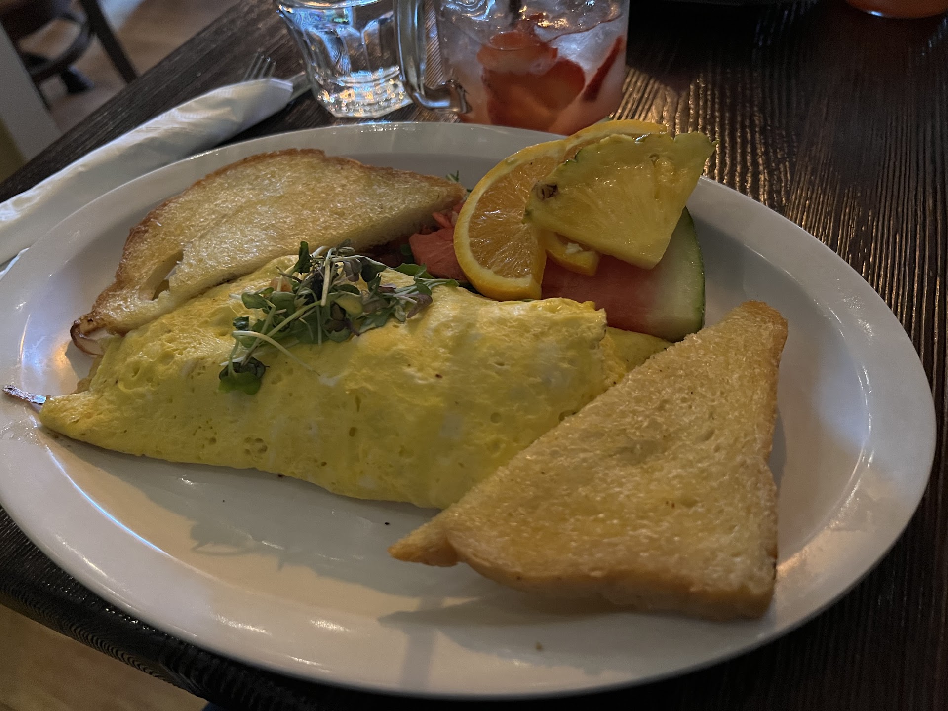We both ordered strawberry lemonade, which was refreshing, but the strawberry flavor took away from the tanginess of the lemonade. I ordered the Country Omelet ($18) and my friend ordered some type of gluten-free tacos that were on the specials menu. The food was terrific!! For me, I got my omelet with fruit instead of home fries. The toast had the perfect amount of butter, and the omelet was flavored well and all the meats were juicy. My friend also completely cleared her plate, and did not have a gluten-attack after we ate here.