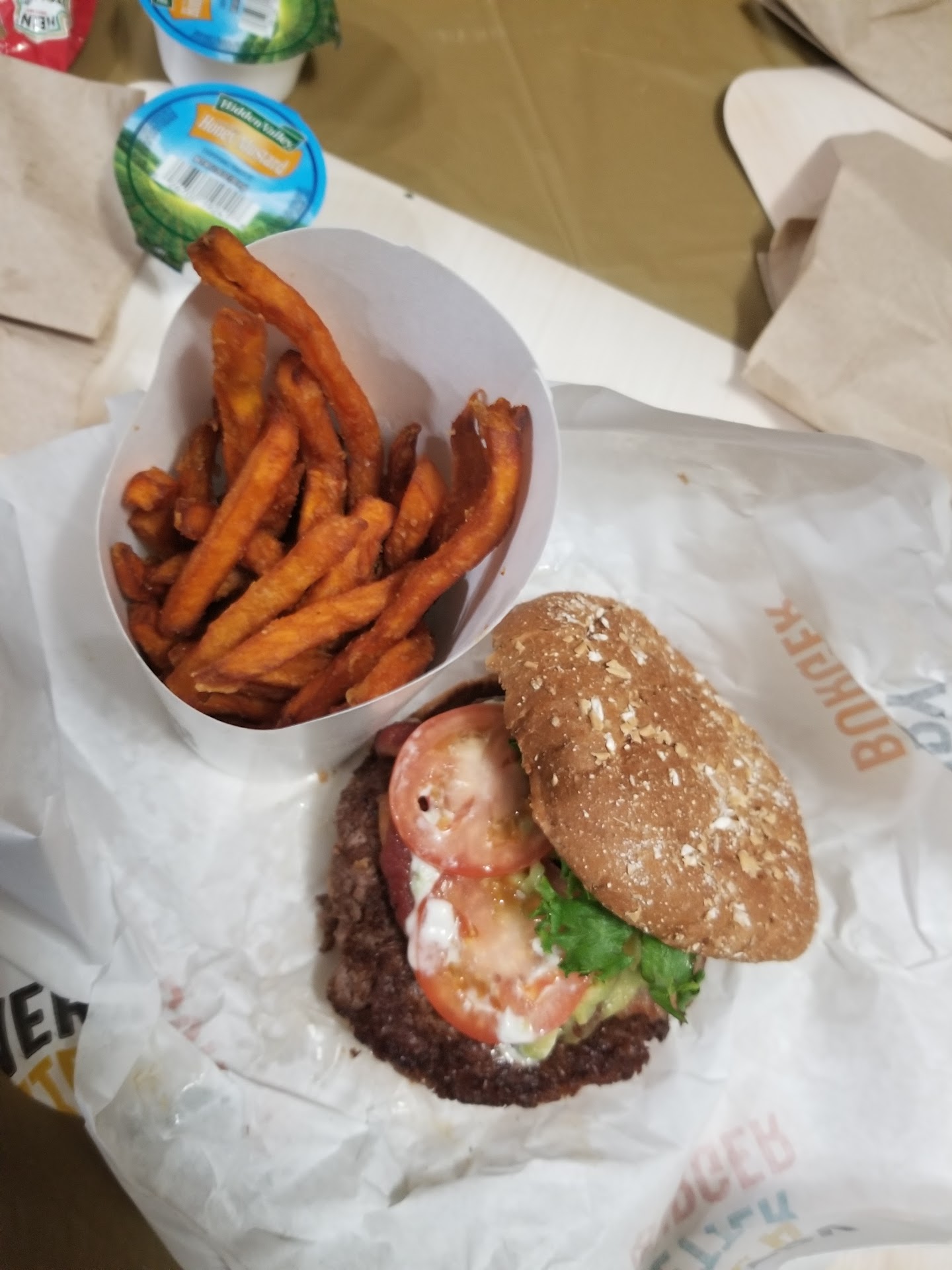 I live in the area I've been going to this location since it opened. Today my husband had the worst experience they have a whole new crew. He went to get us burgers it took them an hour to make two burgers and fries. Well the fries were done and just sitting on the counter the burgers weren't even close to being done that they had to give us new fries. My husband had asked the girl working there if our food was ready since it was 45 minutes she said it's coming out soon. Finally when the burgers were ready they threw one of the burgers on the counter that all the guacamole was out of the burger and it was just was a complete mess. When he said he just throws my burger like that and showed the manager what a mess the burger looked in the container she just said sorry. We will never go back there again. While he was waiting another customer asked for a fork and she said we are out of forks when the guys wife ordered a salad. They also had no bacon. It seems like that place is going down the drain. We use to go all the time and with this new crew I wouldn't be surprised if this location looses business. Not that we were looking for anything but the lack of care for taking their time and just throwing our burger on the counter you would think they would offer something to make the situation better.. NEVER EVER GOING BACK WHICH IS SAD WE LIVE RIGHT AROUND THE BLOCK... they should have never got rid of the old crew this new...