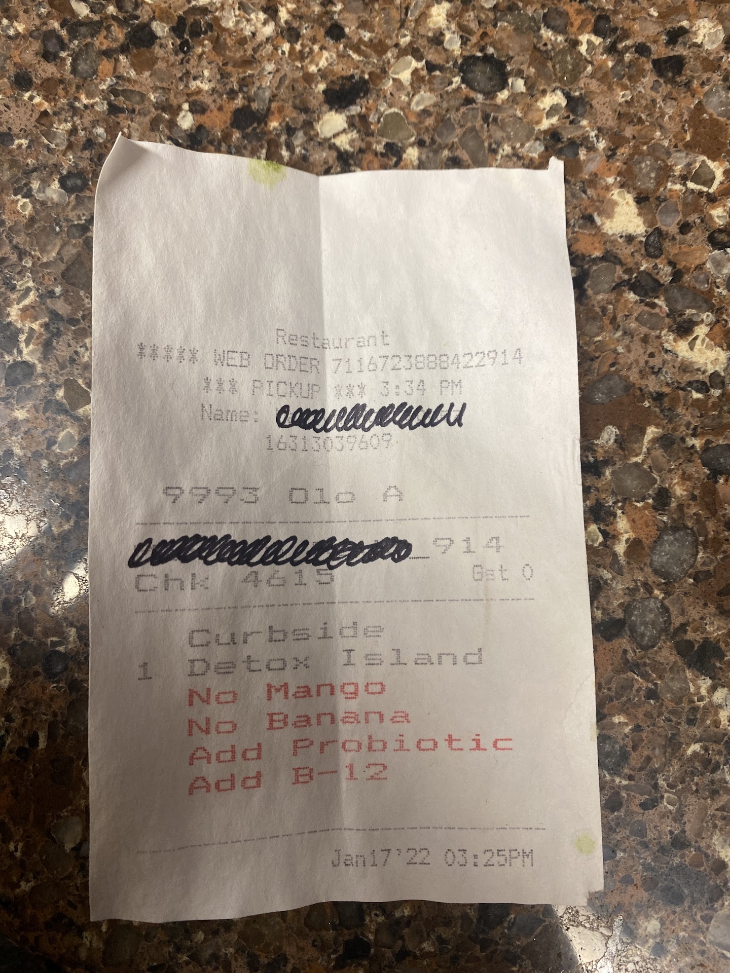 They were very busy i 2 orderd to smoothies. I waited patiently one guy started but didnt finish making my smoothie after about 5 minutes the girl came over and made one of my smoothies with the pomegranate in it. I then was handed that drink. So another 5 to 8mn passed by (i know it was longer than that but im being nice). im still waiting for the peanut one which was still sitting there not completed. I leaned over to the next gurl and informed her i was still waiting for my peanut smoothie. The girl looked around saw the uncompleted one and and proceeded to make it. I really believe something was left out of the shake. It tasted horrible. But i wasnt going back in there to find out, i just wont be back there. There has got to be a better way for them to keep track of orders and who is responsible once that person take up the order. So they are not forgetting. I watched them they were confused at times who order was who and made drinks for people who wasnt even there. I gave 2 stars and that was because i did like the...
