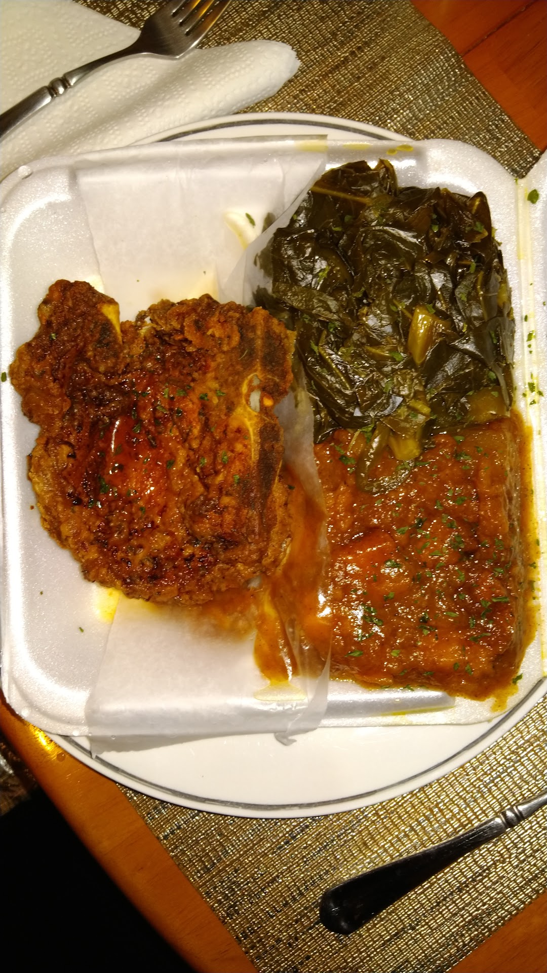 Read moreWhere do I begin....the food is AMAZING. I have never had collard greens like this before. It wasn't bitter at all, which I don't and wouldn't mind but this was unique, bursting with flavor. It had a little zing, a little spice, some heat, sweetness (probably honey), and some fresh acidity to cleanse the palette for the next bite. The Mac "n" Cheese was baked to perfection. It was everything you want Mac "n" Cheese to be. It was creamy, very cheesy, not overly salty, and very savory. I got ribs (since they were out of chicken) and boy did it not disappoint. It was firm but tender, simple but leaving you wanting more after each bite. And the service was superb. The guy working tonight was the owners son. Very kind, honest, and considerate. He even gave me a free piece of sweet potato corn bread and promised it was good, and he definitely didn't lie. My three older who doesn't really eat cornbread ate it up. I give this place a 10/10 and will be frequenting here often. Thanks for an amazing meal and no they did not ask me to write this review and no I don't work here. Just believing not gatekeeping and writing honest reviews. Check them out, you'll see...