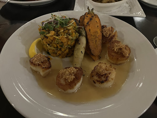When we arrived, we were led to our table promptly, even though we were early for our reservation. Our kind server, Kayla, immediately took our drink orders and started us with some warm bread and butter. We enjoyed it while sipping on our drinks and looking at the menu. The menu was large, but not overwhelming. We each ordered our food. We ordered crab cakes and lobster bisque as an appetizer. I ordered the scallops with sweet potato & brussels sprout hash. My husband ordered the ribeye with Korean barbecue brussels sprouts and potatoes au gratin. We also ordered a side of brown butter sage gnocchi.