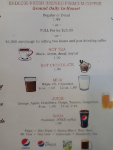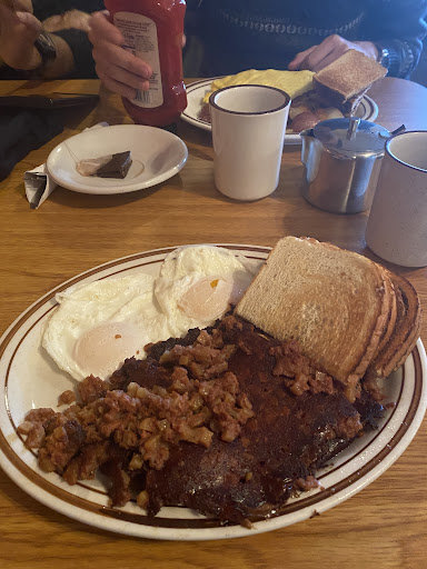 Read moreAre the mushroom and Swiss burger with french fries and coffee. The coffee is endless and excellent. The mushroom and Swiss burger was massive. The burger was cooked to order. I got a medium Burger. I like medium because this doesn't taste too bloody but it's not shoe leather either it's like right in the middle. The fries are crispy on the outside light and fluffy on the inside and they have a light seasoning. For me the perfect amount of seasoning because I don't like overseasoned fries. Interesting to me they had apple butter packets on the table. Got to say I haven't seen apple butter at a restaurant before. I'm sure other places have it I just haven't seen it yet in the area. And I liked it. It was really tasty, even on the fries which is what I put it on. I wasn't just going to eat apple butter up by itself. But it would probably be good enough to eat by itself, too sweet for me though. The waiting counter staff were extremely pleasant and the restaurant and bathrooms were clean. The price was fair. I think it came to about $12.50ish. I'd been working for hours doing pretty hard labor and I was starving when I walked in and overfull when I left. This is a great place for lunch. And they serve breakfast until 1:00 p.m. so...
