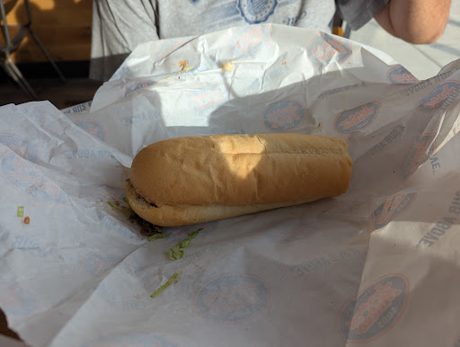Read moreOur first visit to Jersey Mike's anywhere. The line for ordering a sub was about 5 people ahead of us. It didn't take long to be next in line. We ordered two regular sandwiches. The First Sandwich Artist, cut the bread, meat, and cheese for our subs fresh from the cooler on order. Wondering, the fresh cut to order would ensure freshness of ingredients, but; how often is the meat slicer cleaned throughout the day? Second sandwich artist, lettuce, tomato, pickles, bacon, etc. She was a peach of a friendly girl. Chatty, funny, nice. She then wrapped the sandwiches to go. How amazing that she took such care to wrap the ends nicely. Then, she bagged the sandwiches. Wow! There was space in the bag as the sandwich wasn't as big around as the bag. She actually took a fold on the side of the bag, jiggled the sandwich to one side of the bag, folded the bag to snug the sandwich inside, and twisted the open end to keep it all snug and sealed. It was impressive watch how she cared. Hard to find worker's like that now-a-days! We got home and enjoyed our Club Sub, and Club Supreme. Let me not forget, the pickle with a face on it! So cute when the artist showed it to us before putting it on our sandwich. Oh, also, the Jersey Mike chocolate chip cookies were...