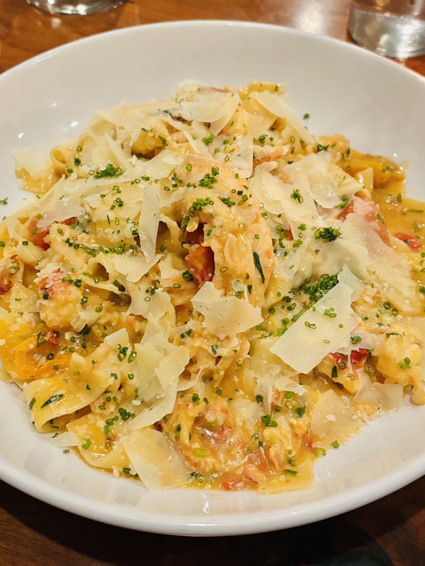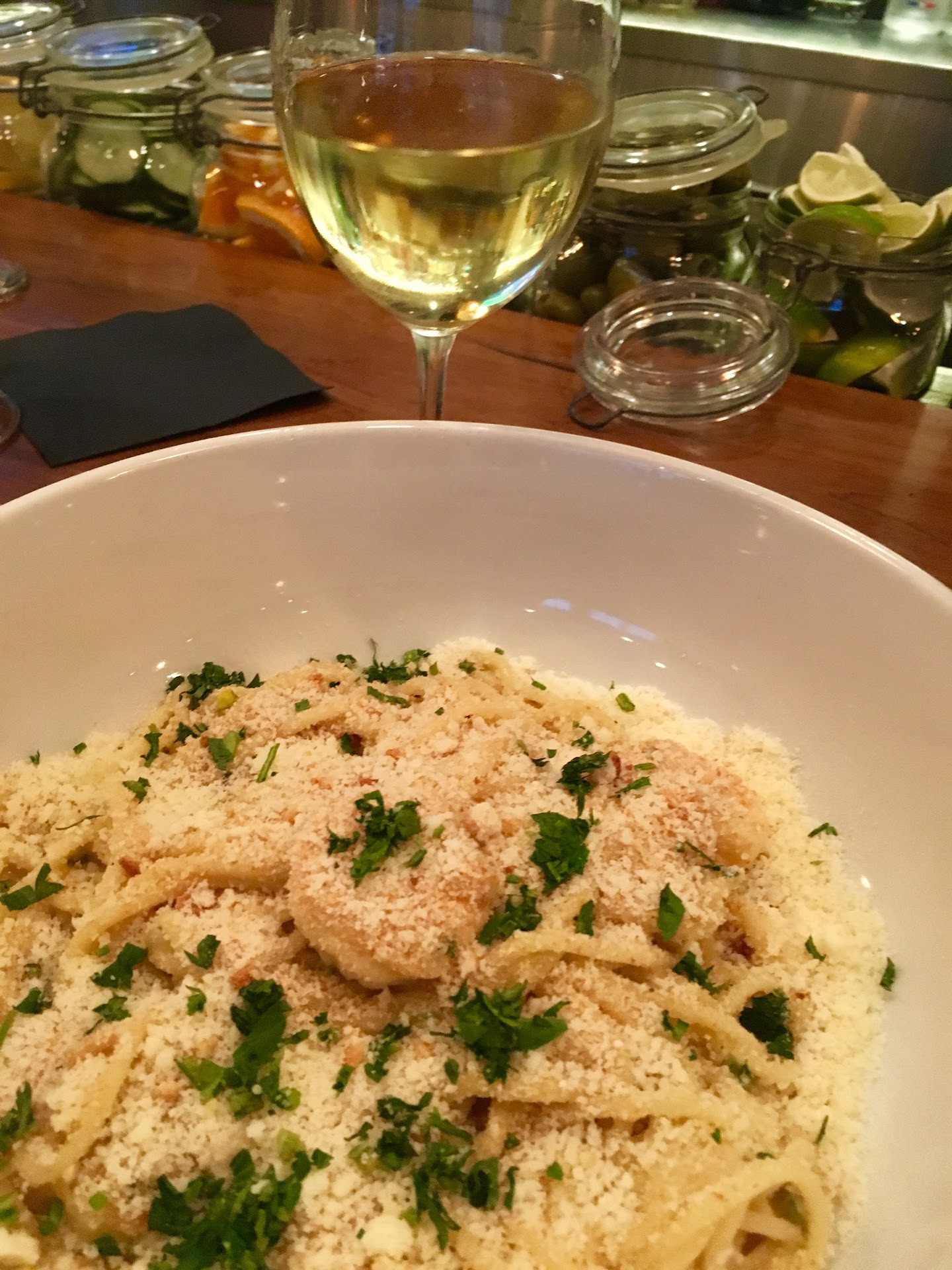 First course was the Lobster BLT Rolls and they were amazing. One of the best lobster rolls I have ever eaten. I selected the spaghetti with shrimp entree which was blanketed in grated cheese which made the dish extremely dry. Usually grated cheese is an option offered at the table but this dish was doused in it by the chef in the kitchen. Too bad because this entree could be outstanding but the flavors are masked by the cheese. And I love grated cheese however this was just too much.