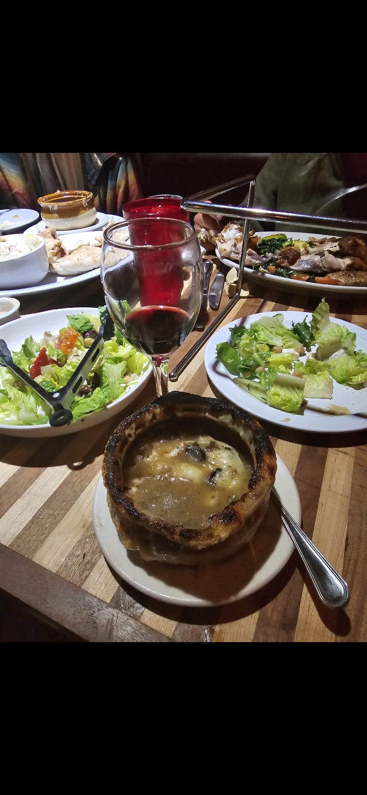 Read moreBenji and Jake's is amazing!!!!! From the second you even see the exterior you get such a warm, charming feeling. Upon entering everyone is so friendly and greets you with a smile. It's decorated so well with so many cute touches. There's an upstairs and downstairs, both flows so well and extremely thought out. From the crowd it Seems really popular too (I can understand why). Upstairs has a bar, tables and an incredible outside deck area overlooking the water. The back even has a sandbox. Now, for the food part. The menu had some pretty phenomenal choices. My table ordered chicken, the onion soup, salads and lots of other sides. Everyone was making those food noises that you only hear when they're loving their food. Lol. Nobody looked up from their plates because they were loving loving loving what they got. The owner kept coming over making sure everyone was happy and satisfied. Like where do you get that kind of service these days. Nowhere. But there. It's such a great dinning experience. I highly highly highly recommend!!!! Oh and the onion soup is VEGETARIAN !!!!! It's incredible. Go try it. You'll be thanking me. The whole experience is sooooo wonderful!!! A+++++++ pic is of midway eaten food so it looked a billion times better before. Cheese is off soup etc. It looked so good Nobody could wait to get started for...
