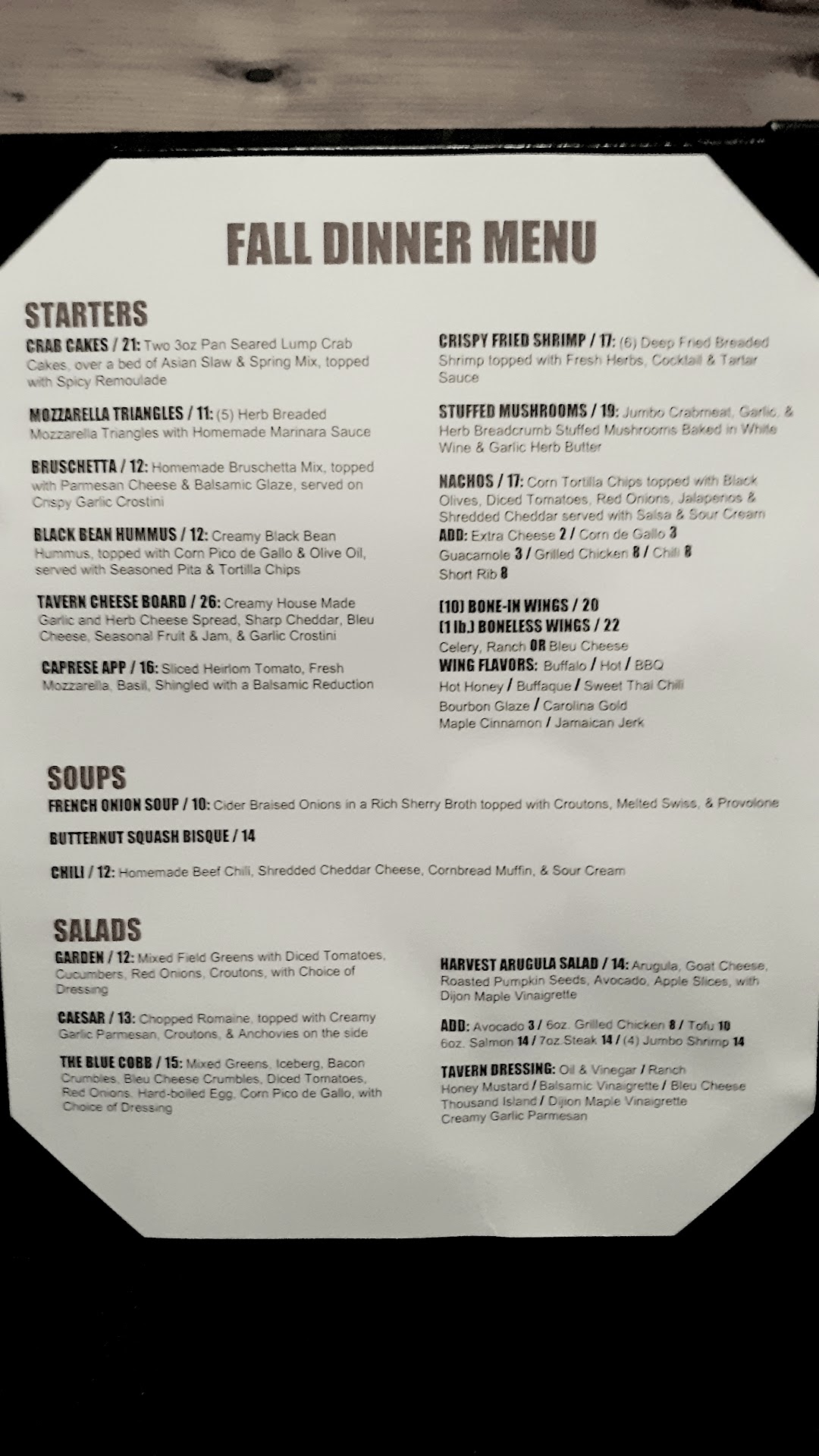 We were staying at Blue Water Manor recently and arrived there later than expected. Rather than searching for other off-site dining options, we decided to save time and have dinner at Tavern on the Lake, which is conveniently located on the resort's own property. Parking is wherever you can find it, and appears to be shared by both resort guests and tavern customers. The tavern was a very short walk from our room and was full of customers when we walked in. We were greeted by the hostess and then guided to the dining room which is in a separate building located a few steps away from the tavern. Outdoor dining with a direct view of the lake is available also. The atmosphere in the dining room was very pleasant and best described as a bit dark, very rustic, and "woodsy". We were seated with menus by the hostess, and our server followed shortly after that to take our beverage orders. Their menu is not extensive for entree selections, and many prices appeared to be higher than expected. Our server came back shortly after that and took our dinner orders of a glazed salmon with mashed potatoes, and a chicken stir fry. Our food was served up approximately 25 minutes later and was served hot. The chicken stir fry was good but nothing outstanding. The salmon was also good, but a bit dry and nothing that would make me want to order it again. The mashed potatoes appeared to be home-made and tasted good. We shared one small-ish piece of pumpkin pie for dessert that tasted good but, again, absolutely nothing that justified the price ($9.00). You could likely buy a whole pie for that price. Our total bill for two entrees, beverages, and the small piece of pumpkin pie totaled roughly $69 plus tax. We can't honestly say that our meals were a real value for that price. While the tavern restaurant is a very convenient dining option for guests staying at Blue Water Manor, it's difficult to justify the menu prices based on quality of the food and portion sizes. The only truly outstanding thing about our visit here was our server, Bre. She was amazing; friendly, very engaging, efficient, available when needed, and very accommodating throughout our meal, so a huge "thank you" to her for giving us something memorable about our dinner here. If you're considering dining here, you may want to review all of your dining options in the surrounding area to make an informed choice. Thanks...