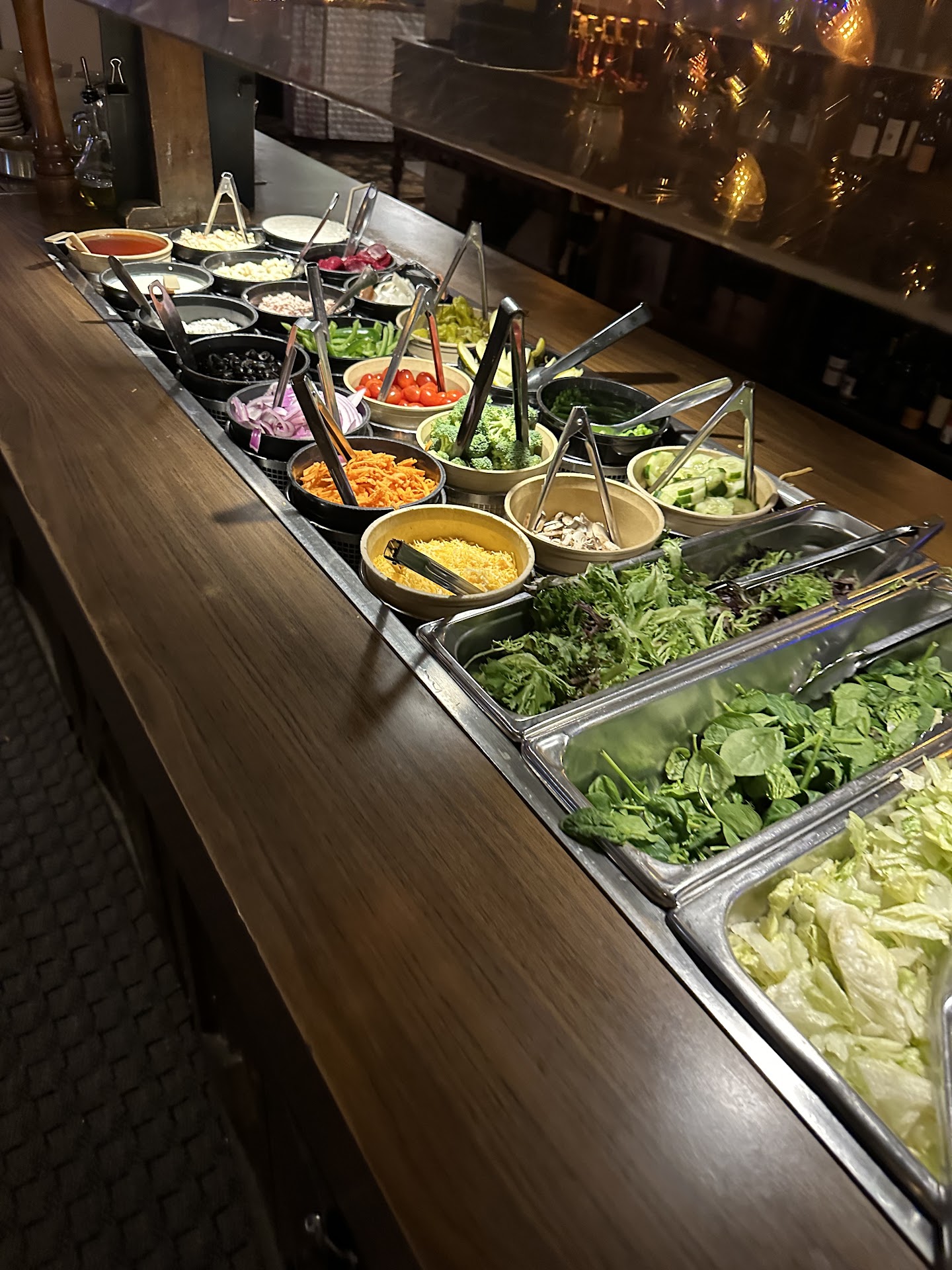 The GOOD: salad bar is included with your meal, which has a lot of different options including soup. Portion sizes for our entrees were decent. Our server was friendly and attentive. We got our food pretty quickly. Environment was nice, more of a romantic vibe, candles lit on the table, dim lighting, old school Sinatra music playing.