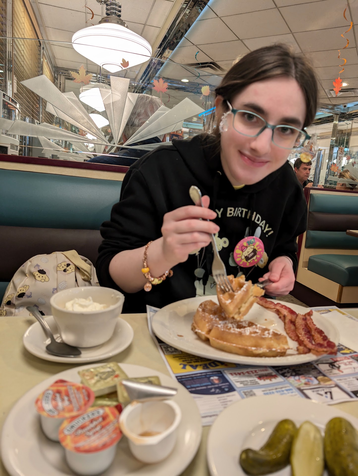 Read morePlace was nice. Got food. Was okay. The menu is very bunched together and prices are confusing. I got 2 stack of pancakes, just under the pancakes are "with bacon, sausage or egg" . So I got bacon and pancakes thinking it came with one of the three like any restaurant. Got the bill and it said 4.90 for the bacon. I questioned it and they said it's extra for the bacon, sausage or egg. I told them it was misleading as they said "with". They had pointed to the right of the price chart. All the prices were bunched right under one another and it wasn't clear to what was priced for what, and wasn't clear that bacon was extra. Server was great but didn't mention bacon was extra. The person on register was too persistent and not listening when I explained my concern of the confusion. Kept thrusting the menu and trying to show me the price. I told him I understand but it was not clear that it was extra. Was talking to my boyfreind about it and cashier came and thrusted the menu in the middle of us talking, pointing at the prices. Very rude and improper. The only reason I gave a 3 star is because I really liked the server but the cashier out of pocket. I guve him a 1 star. Wasnt even told have a nice day after he thrusted the menu in my boyfreinds face. Wont be coming back again. Loved the server though, she gets a 5...