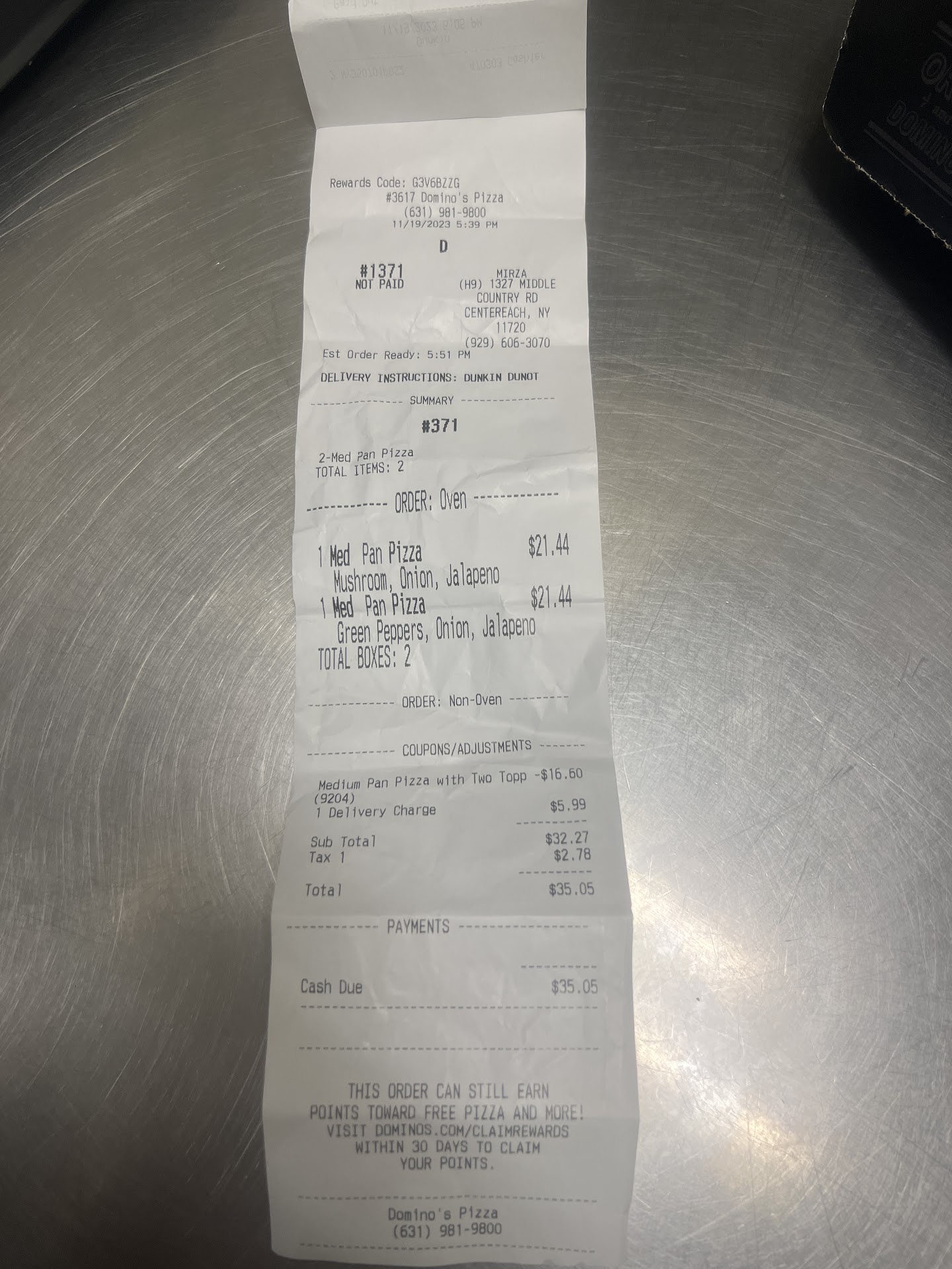 Ā Ā Ā Read moreAbsolutely disgusting EVERYTIME we order there is an issue yet despite previous orders we decided to give them another chance... worst mistake of my life!! The first order came under cooked, barely any topping even after asking for extra mushrooms and not even the correct type of pizza I ordered!! As I said previously this is a reoccurring thing. I called and complained asking for them to remake my order and resend it. Their solution was to burn my order to point that it was inedible. When i called to complain the first time the "manager on duty" told me they themselves cut the first pie and there was nothing wrong with it before they send it out. If they did this that means they saw it was not even COOKED ALL THE WAY let alone well done. When requesting them to resend our order it took well over an hour and our pizzas were burnt to the crisp completely inedible. Never ever EVER order food from this location you will either get food poisoning or chew on charcoal. SHAME ON YOU DOMINOS IF I COULD RATE YOU IN THE...