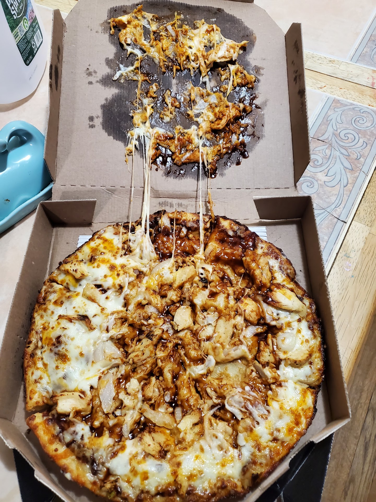 Read moreWe ordered 2 large 2 topping pizzas, 2 8pc stuffed cheesy breads, 8pc bone in wings & a 2L soda and we only received 2 Marinara sauce, 1 for each 8pc cheesy bread & 1 blue cheese for the 8 traditional wings. When i requested extra Marinara sauce i was told it was $0.79 each. Like seriously! Then to add insult to injury, we ordered BBQ wings only to get home & find we were given mild Buffalo wings instead. The taste of which left alot to be desired!đ They definitely needed to be cooked some more. When i called to complain abt getting the wrong flavor wings i was told that "he, the order taker HAD HEARD when i said BBQ wings but that my husband had said mild 3 times at pointed at our daughter. So he went with mild because my husband was the one ordering"đ. Needless to say my husband wasn't saying he wanted mild Buffalo wings. He was just saying get a mild flavor for the wings so our 5yo could eat some. And for the record we were both ordering. In fact i was doing the majority of the ordering as my husband always defers to me for such things. All in all not the best...