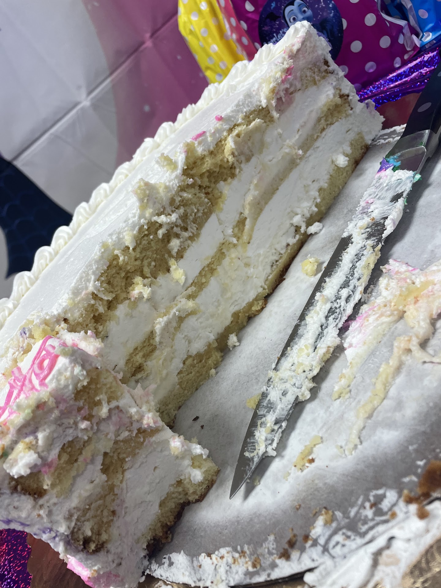 This is my wife’s first time ordering a cake. We needed it for our daughters third birthday party. When picking up the cake it was beautiful, they did a fantastic job. She said the girls in there were very nice and helped her choose the fillings/ designs. After cutting into the cake at the party the cake was all frosting. There was barely any cake. It’s a little upsetting that I paid $80 for just frosting that nobody ate. It was extremely embarrassing having the cake sitting there like this. I will attach a picture below.