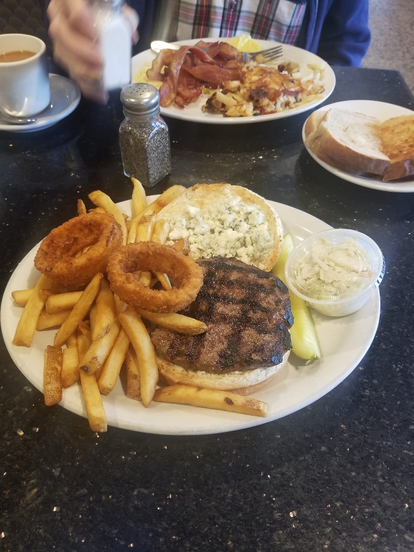 Read moreI try not to leave negative reviews, but tonight's experience earned it, and I was generous with 2 stars. A Monday evening, not busy. Our dinners came with soup and/or salad to start, and usually they come out right away (it seemed like a long wait) Instead the server chose to bring them out with our appetizer, which we ordered the choose your own sampler platter. As everything was brought to the table, she drops the entire tray. Okay, stuff happens, she is apologetic and we sympathize. Another wait. The Greek salad, standard, can't really mess that up. The French Onion soup tasted like salty water. The appetizer sampler platter: baked clams were a soggy, bread crumb, flavorless mixture. Clam strips burned beyond being edible, chicken fingers were fine, as was the spanokopeta bites. My dinner was the steak teriyaki, a small portion, but edible, nothing spectacular. My husband had the parmagiana trio: chicken, shrimp and eggplant. Terrible! The chicken was tough and stringy, the eggplant was burned and the shrimp was burned on the outside and a chewy mess on the inside. The only sauce the spaghetti underneath had, was whatever dripped off the trio on top. The check arrives, with no mention of a discount for the dropped appetizer inconvenience or even an offer of a complimentary dessert. We are not the "Karens" to ask or demand, but that was disappointing customer service. The overall experience was enough to keep us...