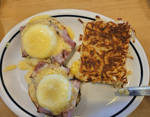 Read moreFirst time at this location. Around 11 am on Friday, for brunch, we were greeted by 2 ladies at the podium, very pleasant and welcoming. Restaurant appeared clean, and bright. Server was very friendly. I ordered the Classic Eggs Benedict with hashbrowns and a side of sausage. I enjoyed the eggs Benedict, perfectly cooked, although the hollandaise was broken and tasted slightly sour & tart, perhaps too much lemon. I always enjoy the sausage links. I did not care for the hashbrowns. They were nicely crisp on top, but a mushy, raw-like mess underneath. (Side note, I had an unsweetened, fresh brewed iced tea, which was very good.) My husband ordered the chicken biscuit sandwich with country gravy, which came with a side, he chose a waffle. He also ordered a side of bacon and a side of fries. The sandwich was a nice size. He liked the country gravy, and the bacon was nicely crisp. Fries were basic, fried golden. The waffle was crisp on the outside, tender on the inside, and delicious! A nice...