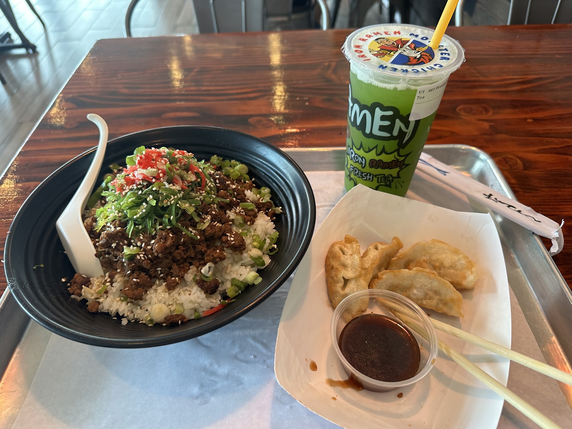 Day 1 was the Kara-Age Don, a lovely flavor filled array of Japanese fried chicken, pickled ginger, seaweed salad, scallions, sesame seeds, spicy mayo and eel sauce. I coupled it with the Lychee Milk tea with Tapioca bubbles and added some lychee Jelly just to try it.