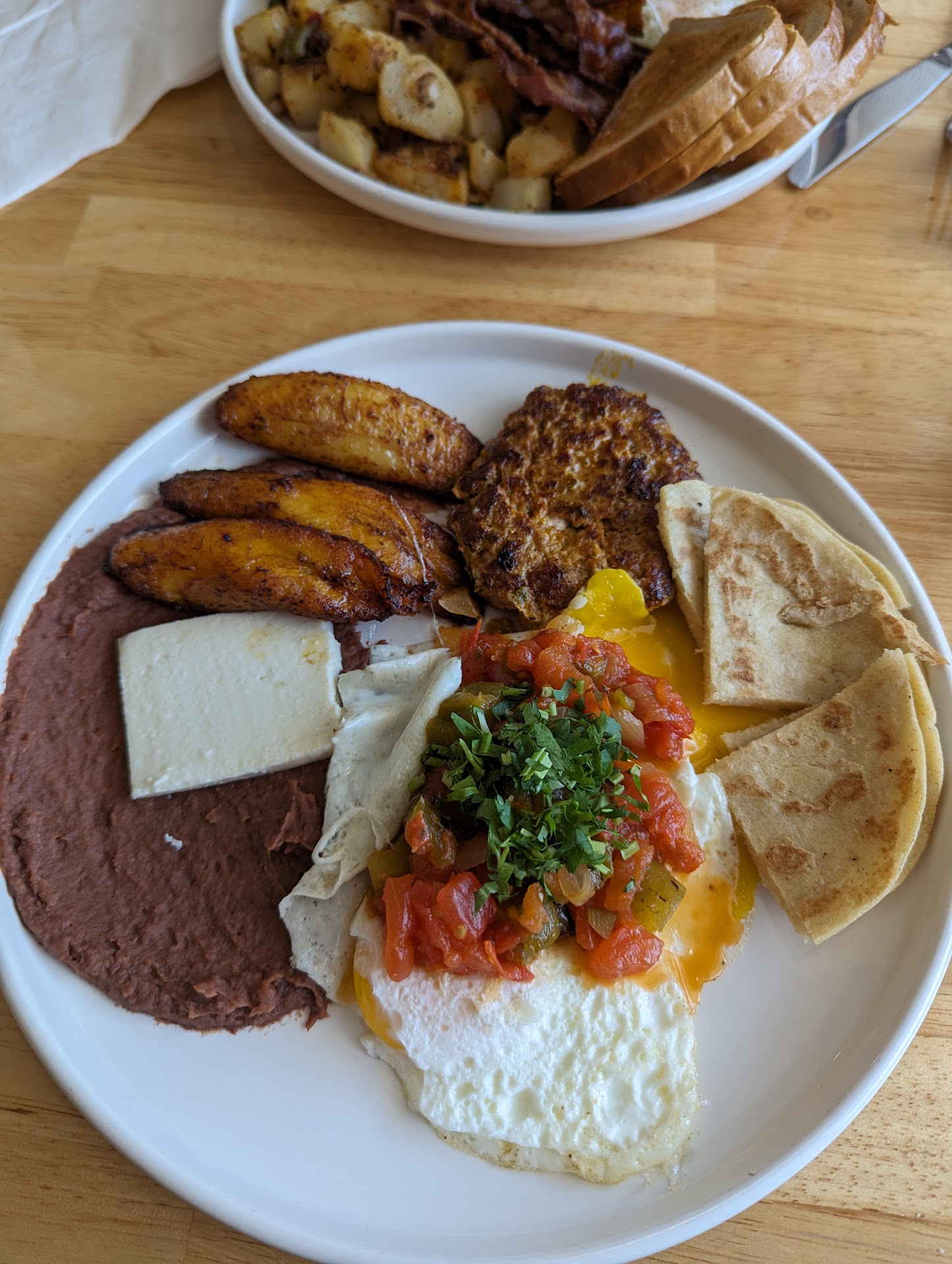 I had the most wonderful time here. Our server was so incredibly sweet, smiling the whole time. Service was great and the food was through the roof. The food tasted authentic, healthy and yummy. I got the short stack meal with pancakes and sausage and my boyfriend got the hungry man sandwich. They pay such close attention to detail to make sure the meal is yummy. Fresh fruit on my pancakes and yummy pico de gallo and sour cream for my boyfriend. I do also have to say something about the sausage, it was amazing. a circular patty really out did it. I do have on slight negative thing to say .. we ordered the sweet plantain banana split.. tasted sooo good but the ice cream was very freezer burnt. The plantains were awesome and everything still tasted good. Just freezer burnt ice cream that’s all. I still loved...