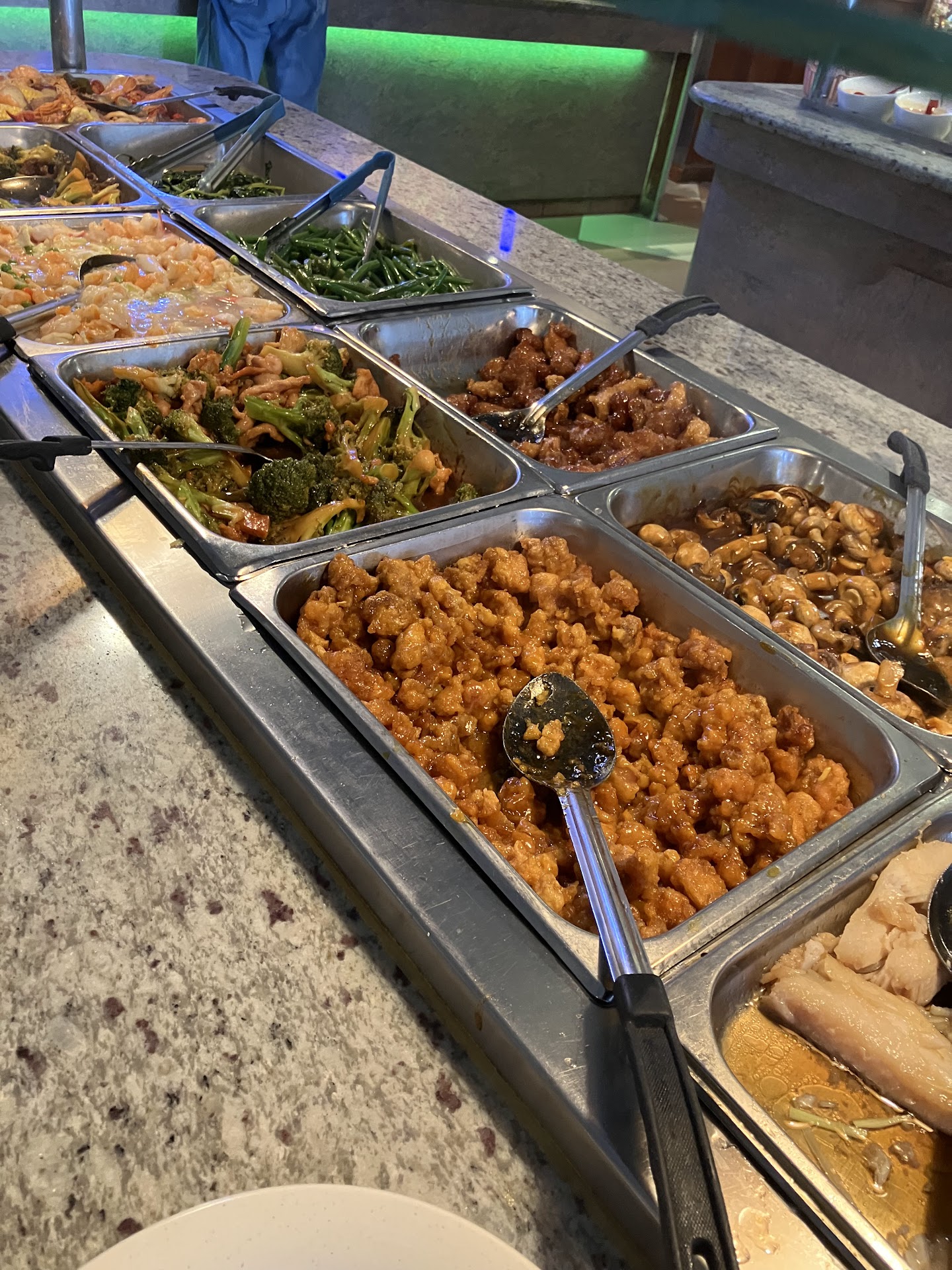 The desert bar has plenty of fresh fruit, rice pudding, tapioca pudding and even small cheesecakes that taste pretty good. Chinese cookies, Chinese sheet cakes, etc. They even bought off the shelf Enterman's donettes.