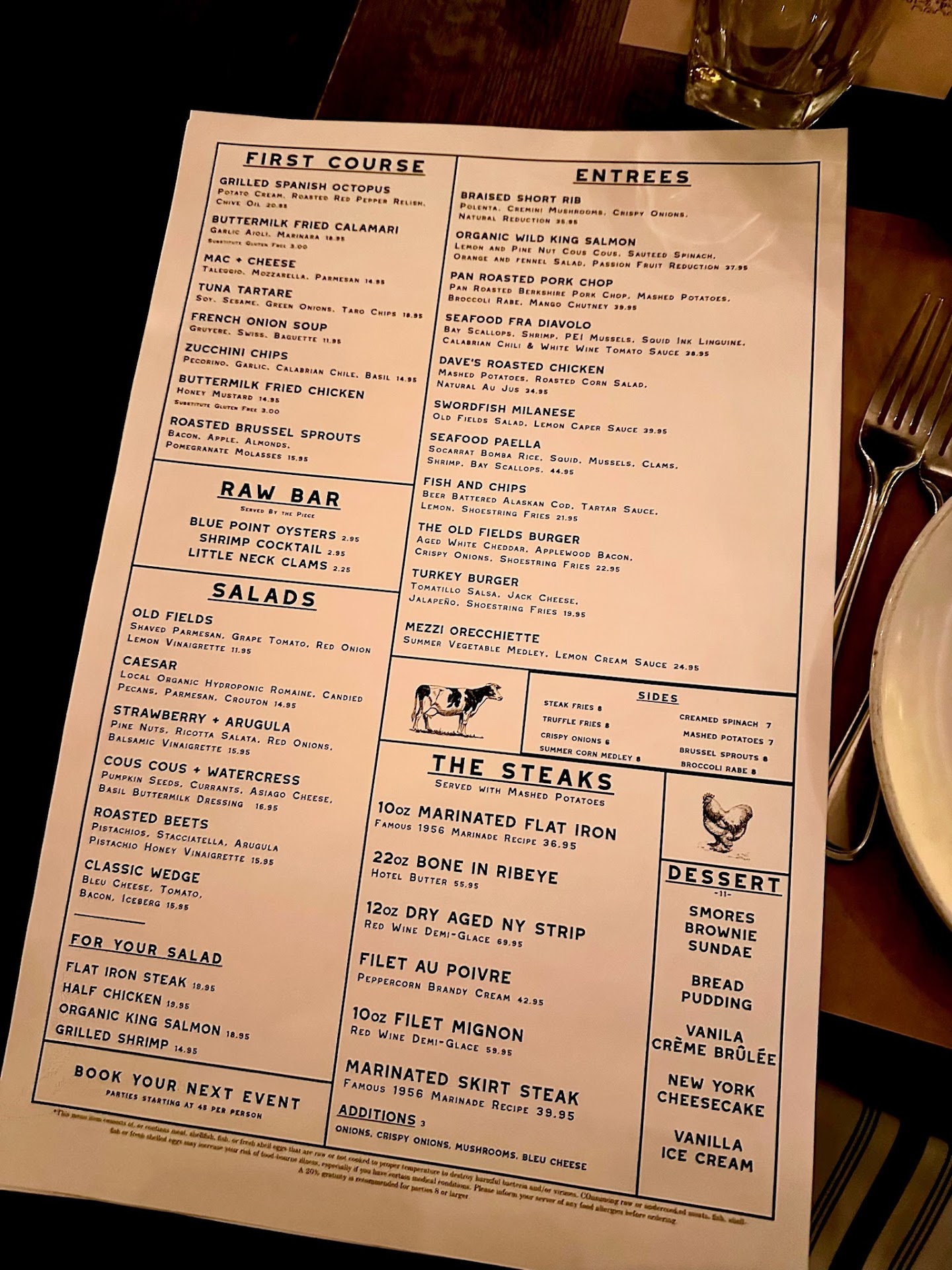 I'm revising my review. I don't do this often, in fact, it's only the 2nd time in 10 years. My original review was 3 stars and hardly tragic, but I was impressed how I was asked to discuss my experience with mgt. Mike was professional, made no excuses and seemed genuinely grateful for what he saw as constructive from my review. He graciously encouraged me to give him another opportunity to enjoy his restaurant more and, because he was a gentleman, I felt I had no choice. It was my night out with my son, who's favorite place is Tellers and he was looking forward to it. I told him we were going to try someplace new and I wanted him to meet my girlfriend (whom he'd heard me mention for the past several months). He agreed. My 12 year old and I picked up Jeanette and off we headed to Old Fields. We had a reservation (which we showed up a little late for) and our table was ready immediately. Fab was our server and he was a delight. I strongly encourage those of you reading this with teens to ask for Fab when you reserve a table at Old Fields. His charm and engaging demeanor brought my otherwise shy son out of his shell and it became the foundation for an outstanding evening. Each time Fab came back to us, everyone at the table re-engaged with each other. We talked about food, drinks, video games and pop culture. Fab overheard Jeanette wanting to try their unique drinks and assuaged her concerns they'd be too sweet with a trick that would serve her indefinitely, wherever we may go hereafter. It worked perfectly. Fab encouraged my son to try Wagyu when he learned he was a Filet Mignon man, if for nothing else, perspective. In the end, we decided to order both and share them among everyone at the table so we could all evaluate the difference. The steaks were magnificent. Justin still preferred his Filet Mignon, but genuinely appreciated having perspective as to why. Desserts were outstanding, apps were yummy and we spent over two hours eating and drinking and talking and laughing and it was as magnificent a meal as any man can ask for. Isn't that what's going out is all about? Old Fields nailed it! The value was priceless. So, thank you Mike and Fab amd everyone at Old Fields for our beautiful dining experience. I can't wait to get back there again. ----‐----------------------------------- The atmosphere is outstanding. The crowd was lively. I understand places in demand require a wait, but they texted us and said our table was ready. We left our drinks at the bar only to stand by the hostess for 20 minutes. Really? Then, when the server was telling us about the different steaks, I had some questions about the various cuts. He had to go ask his manager. Seriously? You're getting tips between $40 and $100/table all night and you don't know what you're serving me? In the end, the strip part of the porterhouse was like shoe leather. It was my rookie move, I should have just gotten 2 rib eyes, but got sucked in to the romance and decadence of a 40 oz. porterhouse that served 2. Had the server appropriately explained the difference between porterhouse and T-bone, I would have. But isn't that the point of going to a 5 star restaurant? Should I be Googling to know what I'm about to order? The server did pick really great glasses of wine for us and did accommodate our side selections graciously. Management is who failed here. They left us standing with masks on for 20 minutes after telling us to leave our drinks and offered specials they hadn't properly informed their servers about. Anyway, when I'm spending $240 on a meal for my gf and I, disappointment should not be...