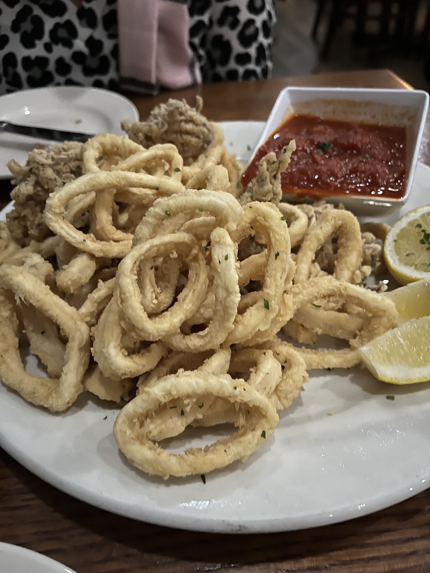 We started with the fried calamari which was delicately seasoned and floured. The plate was loaded up with rings and tentacles of nice size!!!! They were tender and very delicious! Then we got a huge and delicious salad which I didn't expect!!