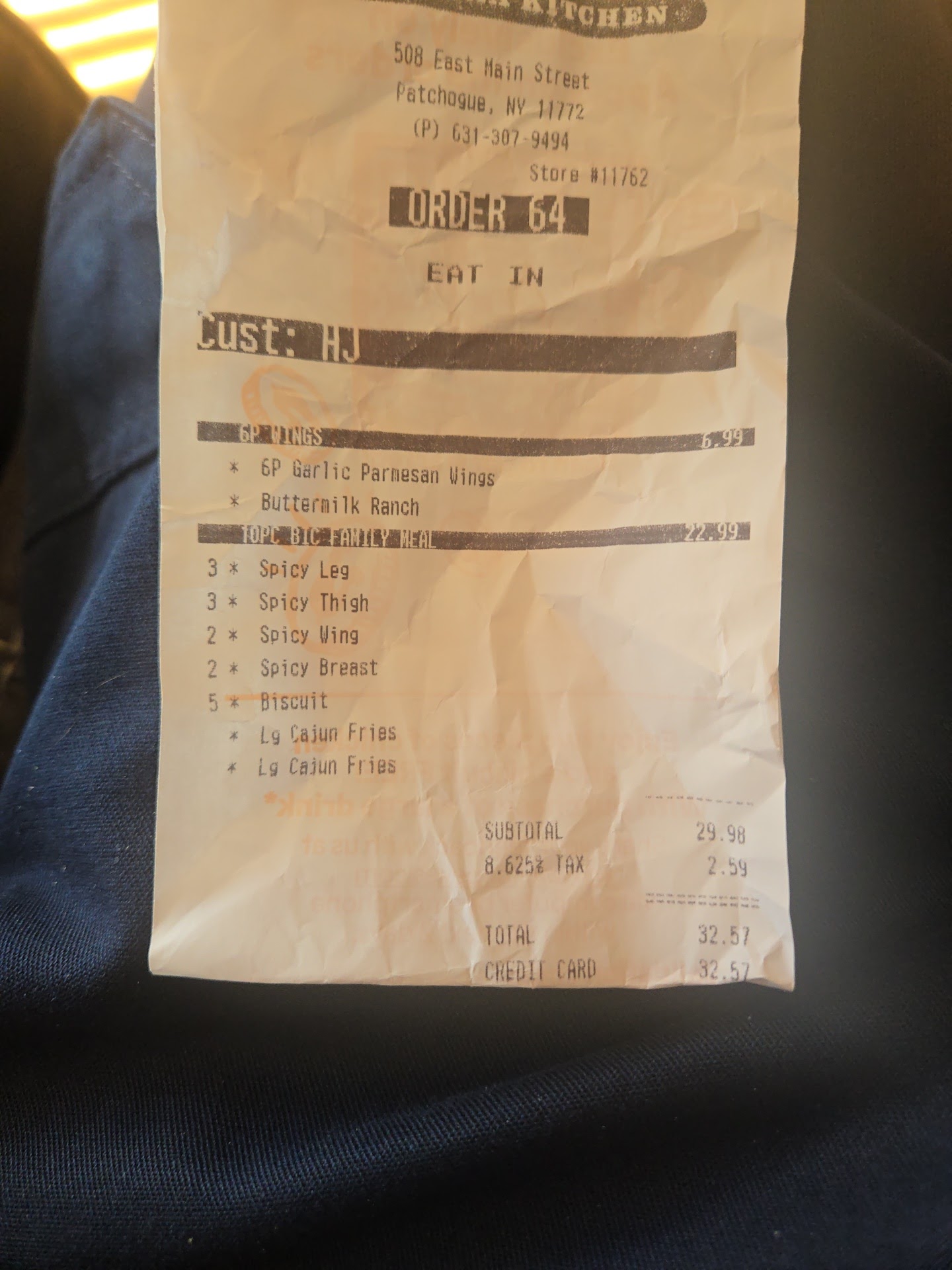 My experience was doomed from the moment I pulled into the drive through. When I arrived the gentleman asked me to give him a minute and I said âno problem.â About 4 Min later he said âHelloâ so I responded with, âHello.â He then asked me to give him another minute. I said âsure thing.â When he came back and asked for my order I asked for the 5pc tender combo, spicy. He told me âwe donât have any tenders.â I was confused and said âwait, you donât have any tenders?â And he said âno.â But as he said no another woman came through the loud speaker and said yes and then the man said ok 5 pc tender. Now Iâm super confused. So I asked again, âyou have tenders?â He said âyes 5 pc tender spicy.â He asked for my side, I told him fries. I then ordered the 5pc tender combo with 2 biscuits and 2 sides for my wife. When I got to the window the same man asked what drink I wanted. I told him Dr. Pepper. He looked at the machine and told me they didnât have it so I got a Vanilla Coke. When I paid, my receipt was not at all what I ordered. The price was correct however it was not what I ordered. So when we got our food I pulled up out of the drive thru to check on everything. Now, for clarification, I ordered the 5pc tender meal, spicy with fried. My wife got the $10 box thing with 5 pc tender, mild and Mac and cheese with green beans. Her meal came with 2 biscuits, mine with one. When we checked the food, there were 7 tenders (thatâs not even an option on the menu) and 2 biscuits in that box. We also had the Mac and cheese and green beans. But there was another box of 5 biscuits. I pulled around and was going to go inside when that same employee was coming up to my truck to greet me. He had a box and said that he gave me the wrong thing. So I asked what he had. He told me he had the 5pc spicy. He told me the box of biscuits I was holding wasnât mine, so I went to give it back to him. But he told me to keep it. So I did. I decided to check one more time before we left, good thing. No fries. So I parked and went back in. There was a total of 3 people working. I think they were all taking turns cooking because no one was back there. There was my guy in the drive thru, a woman up front and another guy running around. Everywhere. I stood to the side (there was easily 5-6 ppl waiting for food inside) because I just needed fries so I figured Iâd wait. While waiting I could see visible frustration on the girl that was working there. She needed to refund a family for their food because it was taking too long. Finally the guy running around asked if I was ok, I told him I just needed fries as I didnât get them in the drive thru. He gave me my fries and off I went. When I got home, my chicken was not spicy and because of all the waiting around, all of the chicken was pretty soggy. Not the normal crispy that Iâm used to. I often say I wonât go to this location because I feel like it is always chaos in this location. Instead I drive pretty far out of my way to the location on William Floyd parkway. On this nigh I figured, why drive. But you know what. I...
