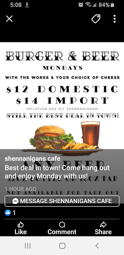 Read moreMy friends and I had a Christmas party at Shenanigans. Although the room was cute, and clean, I t very small to accommodate all of us. They put out the appetizer’s which did look kinda tasty, but the taste was terrible! When they out the food out, we had to ask for serving utensils. The shepherds pie was watery and greasy, but just a little bit of mashed potato on top. The chicken marsala was hard watery and disgusting. They also had Penne a la vodka! That dish was ok. If it wasn’t for the desserts that everybody who went there supplied and bought, I would’ve went home hungry. I would never eat there again, and I don’t think anybody else in our party would either coffee is supposed to be included. The survey came with one cup at a time and that everybody got coffee. Nothing else was offered. They only had Sprite and Coke to drink in pictures and there was only one picture of each I wanted a picture of water and I couldn’t even get a hold of a server. The parking lot had huge holes in the back of the building. It was raining so we had to get out of our car and...