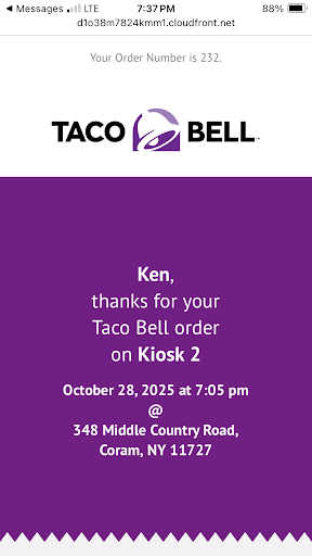 The older hispanic general manager that wears glasses is in incompetent, useless, ignorant, piece of you know what. I pick up at this store as a delivery app driver (only when orders are high paying or nights are super slow) and this is literally the WORST location I ever pick up between all the towns in North Brookhaven. I normally take at least 15 minutes to arrive for pickups at this location because I know they won't be ready. Yesterday I arrived after 15 minutes. As usual no one comes to help to ask who I am there for. I left after a few minutes of standing there like a dummy for another 10 minutes to go pickup at Coram Diner and returned. Now I was far past 30 minutes into the first Taco Bell order and they still didn't start it after over a half an hour of me accepting the offer. I finally get the general managers attention to ask what is going on and he starts going off on me that if I don't like it I can leave now and get out and not pick up here anymore. Instead of apologizing for literally always wasting my time and costing me money, he begins to berate me in front of other customers and his employees yelling at me that I can leave if I don't like it and not pick up there anymore. He said I always have an attitude. So I am supposed to be be happy that it takes them nearly 40 minutes to begin an order nearly every time I pick up there? I am not supposed to say anything? They always mark orders ready for pick up when the orders haven't even been started or they frequently give drivers the wrong orders and then won't remake the orders if they gave them to the wrong driver so you have to leave and make no money after wasting time driving and waiting there. This manager has no clue how many problems he causes delivery drivers. No one should ever be spoken to the way he did to me yesterday just for asking how long until the order was ready. I had every right to be upset for the order being over 30 minutes late. Speaking to me like I was a doormat is something that I will not tolerate nor should anyone tolerate. I will be contacting corporate and possible legal actions of libel. This is the absolutely worst mismanaged fast food place I have ever seen. It is a total joke. The best part, is the orders are actually completed faster when he...