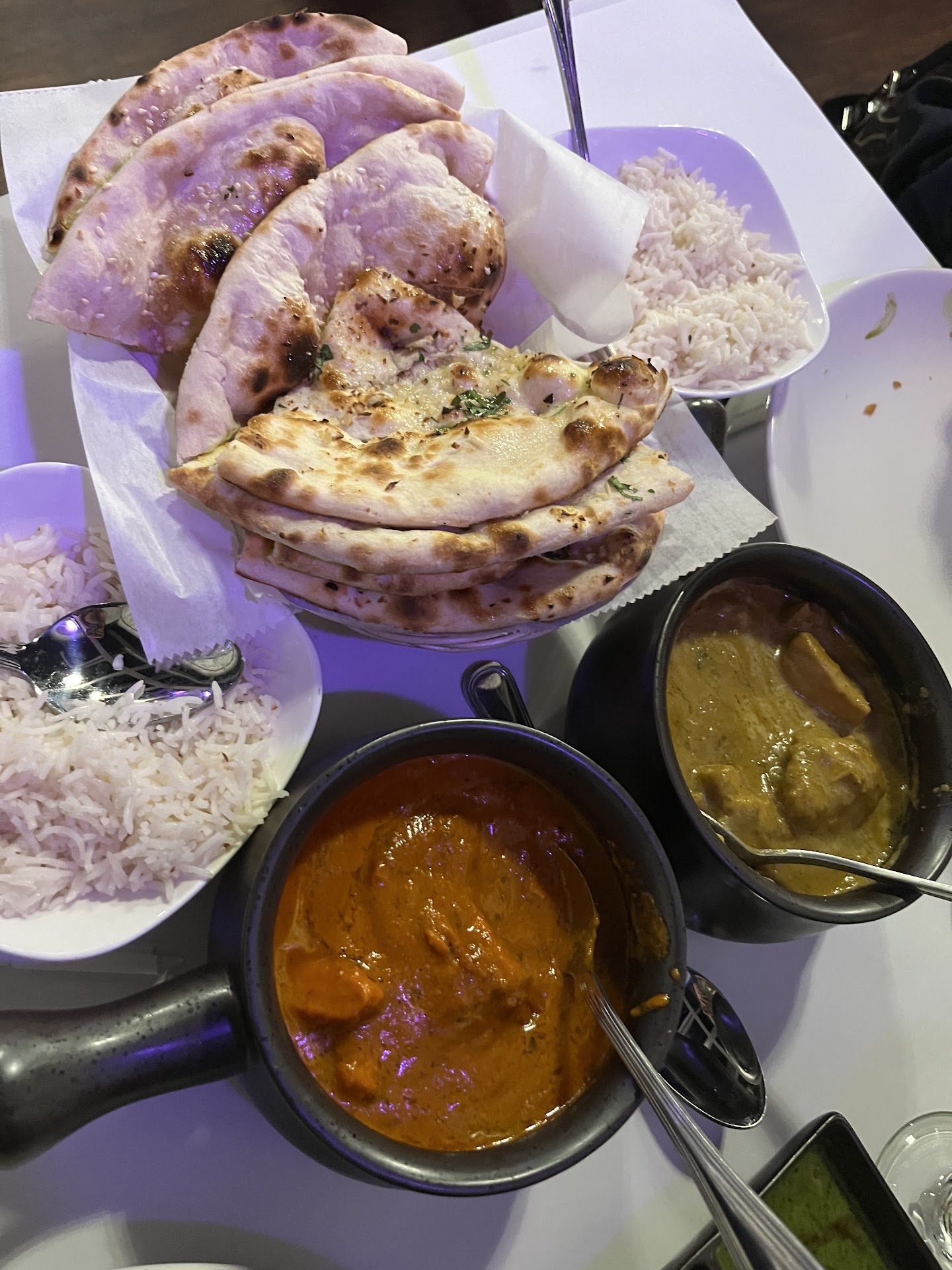 Read moreBeen wanting to try Indian cuisine for a long time and im so glad i found this place. The food was amazing ! Got the Butter Chicken and Chicken Korma, it came in mini clay pots which kept it hot. The sauce was a gravy type thickness and so flavorful. The chicken was all white meat. The garlic naan and sesame naan were, crispy and flavorful. The rice that came with the entrees was surprisingly tasty as well, almost had a sweetness to it. Our waiter was so friendly and attentive. I will say that if you're not a fan of spicy food , definitely let your waiter know. I would recommend to the restaurant that they put a spicy symbol on the menus next to dishes that are spicy so its easily recognized. For example, when I ordered the samosas, I missed that it said spicy in the description. I still enjoyed it, just wasn't expecting the spiciness. Also, Im unsure if the sodas were poured from a can or there just wasn't carbonation in the soda machine because my soda was flat so there could be improvement there. The ambiance upstairs was relaxing and you can really feel the presence of the culture. The downstairs area had a trendy bar area, colorful LEDs and wall art, all without being tacky or too much. They had a DJ playing which I enjoyed while waiting for our table. It wasn't too loud to where you couldn't have a conversation. Bathrooms were also very clean with nice decor which i think says a lot about a place. All the employees were welcoming and consistently making sure everything was satisfactory. Cant wait to return and...