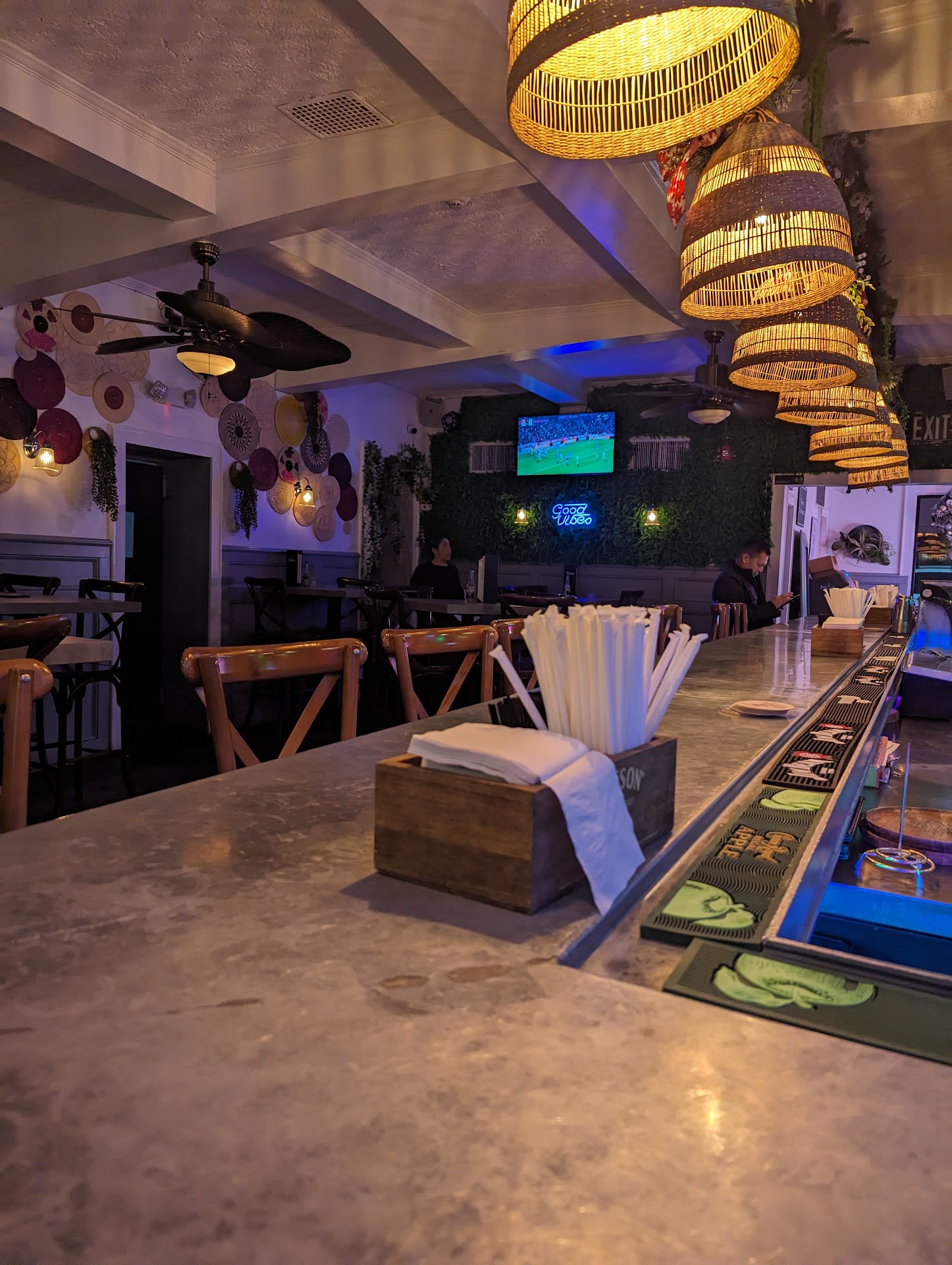 We ordered: -guacamole and tostones. Pretty decent guac with borderline oily tostones. -coconut shrimp- came with a nice dipping sauce but the container it came in was less than half way filled (weird). The shrimp were over cooked. -clams with tequila broth- we liked the idea of this dish and it’s presentation but unfortunately the broth was way too salty. Plus there was more bacon than clams which prob added to the salt overload. -beet salad- this was a simple beet salad that was actually delicious. I like the greens they use, everything was prepared fresh and nicely chopped. -pallea- came DRENCHED in water (the chef calls it broth), there was more broth than rice. I’ve had moist or even wet pallea before but this was more close to a soup. Everything in the dish was swimming. This was a complete fail for us and we had to send it back. -lamb chop special- the lamb ( which we ordered well done ) was absolutely cooked to perfection and super tender. The additions on the plate I cannot say the same for; the mashed potatoes were borderline liquid and the Brussels needed more color! -cucumbertini- pretty decent and balanced drink. I had two. -Paloma- decent -tamarind margarita with tajin rim- beautifully crafted cocktail with the right everything. Really enjoyed this one.