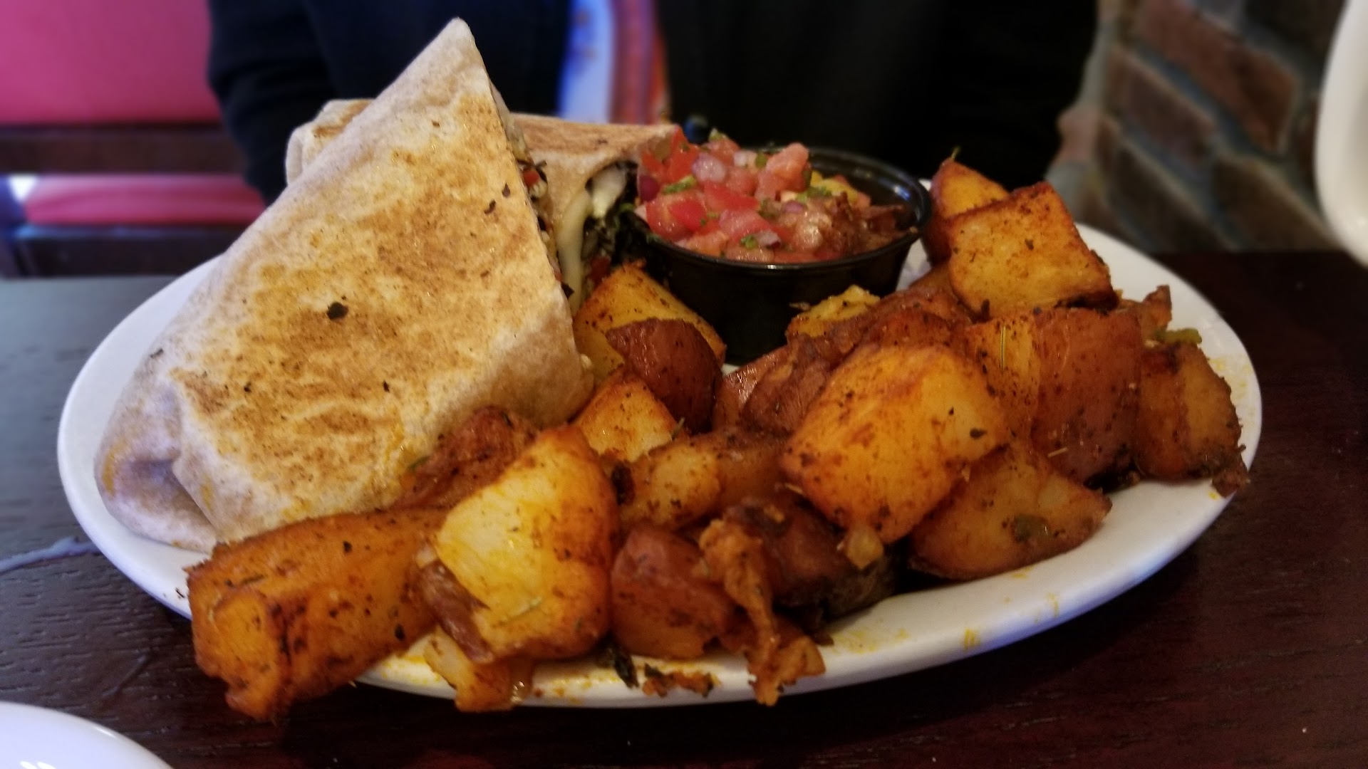 Read moreThe decor and atmosphere is very nice. It's pretty loud in there because it's always full. The staff are pretty friendly. However, my boyfriend and I ordered the seasonal buttery caramel apple latte and they served it to us in a short, wide mug with a green sugar rim, which was pleasing to the eye but it wasn't too fun when I couldn't even pick up the mug to drink it, due to the coffee and green food coloring dripping down all sides of the mug. It was a mess and so full that if I picked it up without reaching my neck down to drink it first, it would have spilled everywhere. She handed us a ton of napkins but if I were a server, I would never feel good serving someone a sticky mess of a coffee. It wasn't that great either, nothing special, especially for $6. I enjoy Starbucks better and you get more for the money you pay there. The Hawaiian breakfast quesadilla I ordered though was delicious! It had fresh pineapple inside with delicious pulled pork, eggs, etc. The home fries were pretty good but a little too soft. I would rather them have a bit of crispness to them. My boyfriend said his food was okay, not really great and he didn't enjoy the sweet potatoes mixed into the home fries. He received more sweet potatoes than regular potatoes. My friend liked her food but once again, she didn't think it was that great. At the end of the day, I'm glad we had gift cards because we waited half an hour to be seated, dealt with that mess, then spent around $72 plus tip for 3 people to eat breakfast. I won't go again unless I receive...