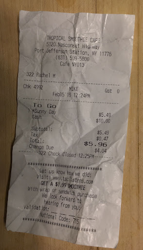 I have been going to tropical smoothie in Port Jeff for about 3- 4 years and every so often they experience technical difficulties like any other business. So Ive experienced some not on point smoothies before but on February 5th I could not drink this it was gross but I was at work when I discovered this so I put it in the freezer took it back the next day and explained my situation to the Manager who has waited on me 30 plus times and gave me a hard time because I couldn't find my receipt . I have since found my receipt and e-mailed it to headquarters and they said they were sorry and there willing to give me 3 free smoothies which is actually 2 because they have my 6 dollars for the one that sucked which I brought back. I refused there rediculess offer and will never go in another tropical smoothie ever. There are some great employees there but the smoothies are very inconsistent and just not worth...
