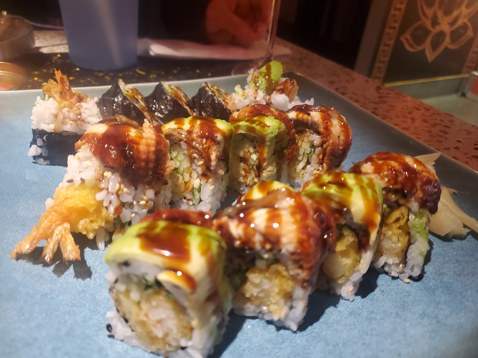As I’m nibbling on my appetizers, not trying to fill up we realize we’re waiting a really long time for my sushi rolls. I look over at the Japanese sushi bar and I don’t see anybody behind they’re making my stuff I then see the sushi chef walking from the back kitchen to the bar assuming he’s going to start on my rolls. I then see him walk back to the kitchen and disappear for a few minutes and then he comes back. We still waited.