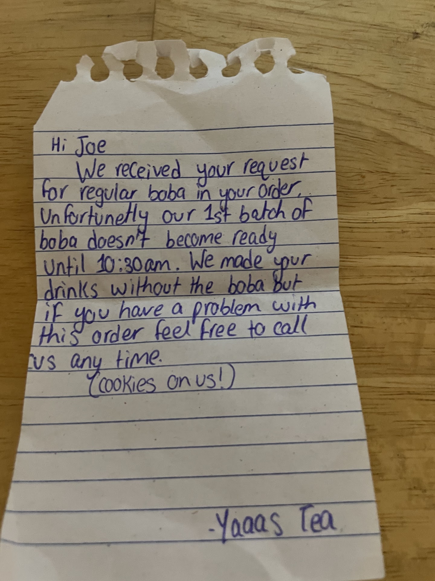 To my surprise, the staff working that morning had written me a note by hand explaining that their boba is only prepared at 10:30am, and that they were very sorry for the inconvenience, also including a free air freshener and batch of cookies!