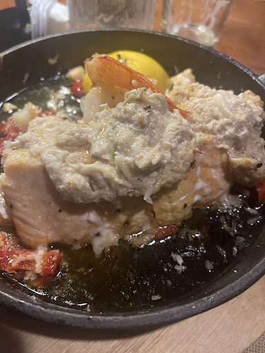 Me - special - Salmon stuffed with crab and shrimp (no prices listed) 1/10 and loaded baked potato 5/10. Stuffing was liquified mush. Salmon was slimy and soft inside. The part on the hot plate and outside was fine so I ate that. Left it all there. Mine was served and we waited another five minutes for my potato and my wifeās dish to finally arrive.
