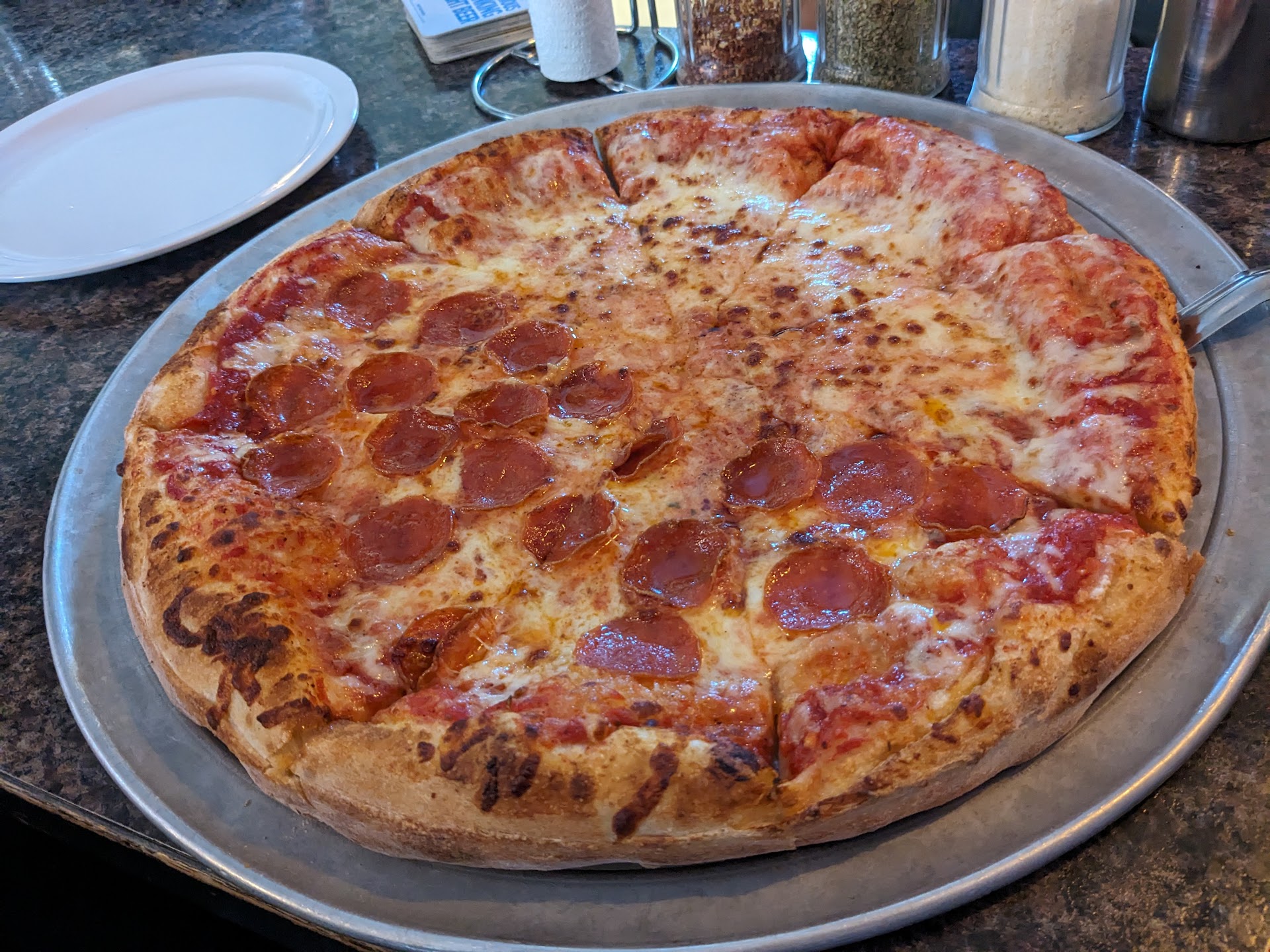 The food is and always has been pretty darn good but this was my first time here in years and just have a few minor suggestions. Hire a waitress. We had to get up about 10 times to get stuff for ourselves. You're missing an opportunity to give the town more jobs and give your customers the opportunity to sit down and relax. Also, I ordered my wings with celery, nothing was said, they came out without, I went to the counter (again) and was told no celery. Really? $18 for ten wings and I got a little throwaway kens blue cheese and no celery? Geesh. We also ordered what they said was a small personal pan pizza for my five year old and out comes this massive thing that was too big and expensive for what I needed. The same thing happened when I ordered half of a salad bc there's no side salad on the menu. Out comes this giant salad with broccoli (wth?) and it was overkill, lettuce cut way too big and portion too big, again with a tiny ken's dressing. I would really suggest a kids menu, maybe do what other places do and have crayons and the menu on a paper coloring page for them. On a positive note, the pizza was great, the pizza Roll was amazing, the place was clean, and it was nice to bring our kid back to a place we enjoyed so...