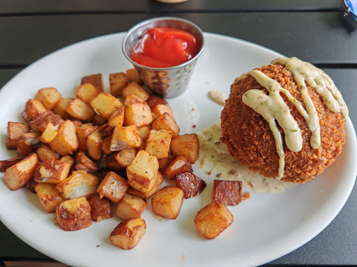 Food: Fun menu items and nice presentation. 2 things- the main food was hot but the potatoes that came with it were not. Also one sandwich was labeled on the menu as coming with a certain side, but came with a completely different side with no warning or explanation. 4/5