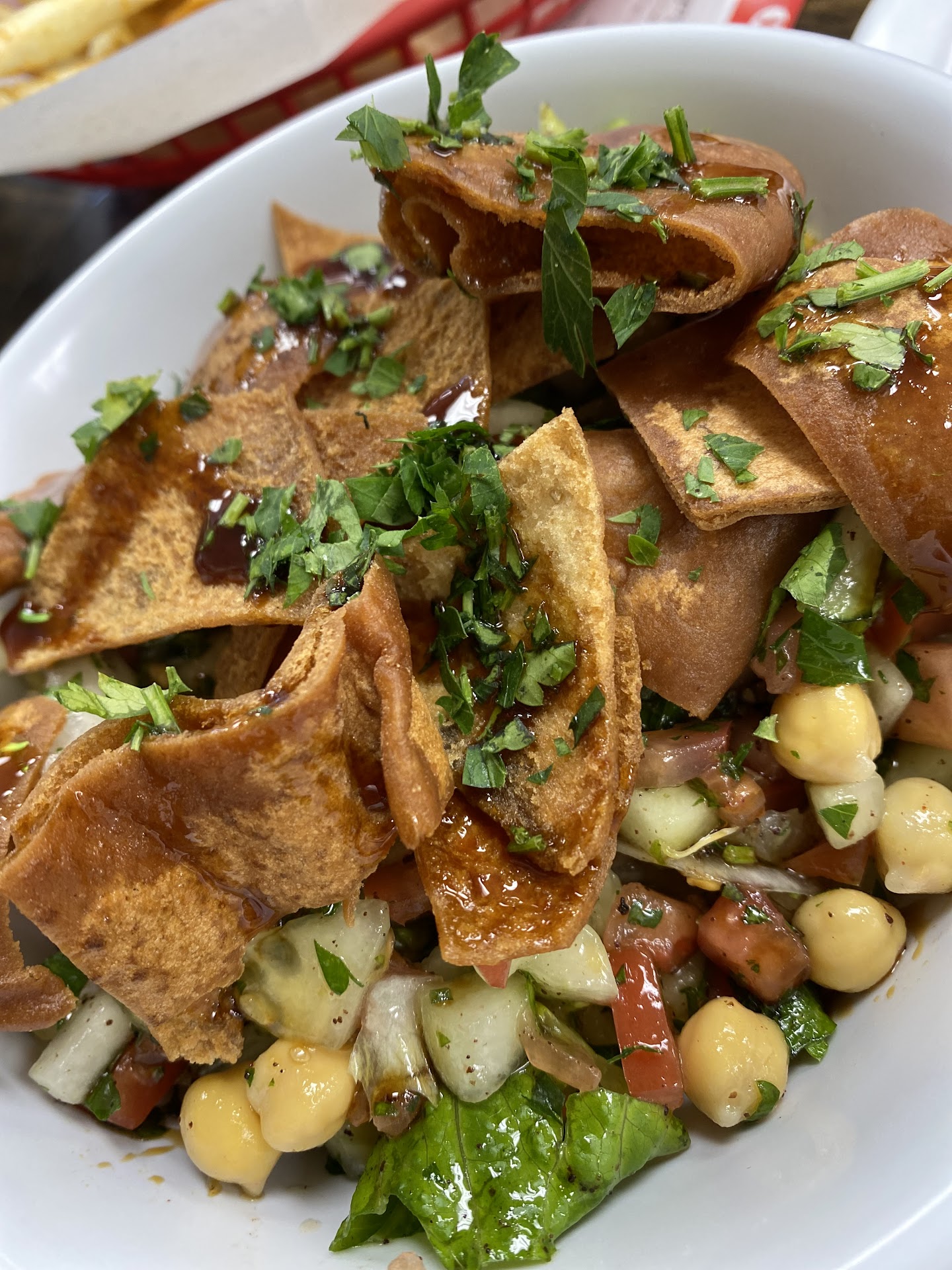 After some feasting, three crispy balls of hot falafel also arrived. These were the real thing- hard brown crust outside, full of soft chickpea, green savory herbs and a nice sweet note (fenugreek?) inside.