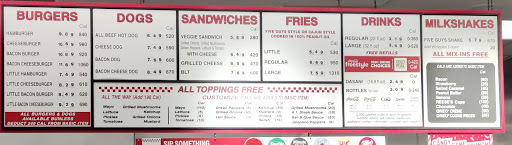 I almost went 5 stars here. Only reason i didnt is because of the price. For two of us to get 2 burgers, 2 drinks and 1 fry, it was just over $30! That is a bit crazy. Now that that is out of the way, i left here so full that all i was wanting was a nap. Lol. Burgers were cooked to perfection. Toppings were beautifly sauteed and flavorfull. Now lets get to the frys. Im sure every other review said this but one order can feed two people and a kid. They actually placed the cup of them in the bag then just poured another full orders worth (not ordered) in the bag covering the burgers. Had to be 1 lb of fries. And they were crispy on the outside and moist on the in. Id say 2nd best fries i have ever had in my life. Yes, even better than homemade fries from the fair. Ok im done. Of you dont want a five guys burger after reading this, do yourself a favor and get a salad cause your...