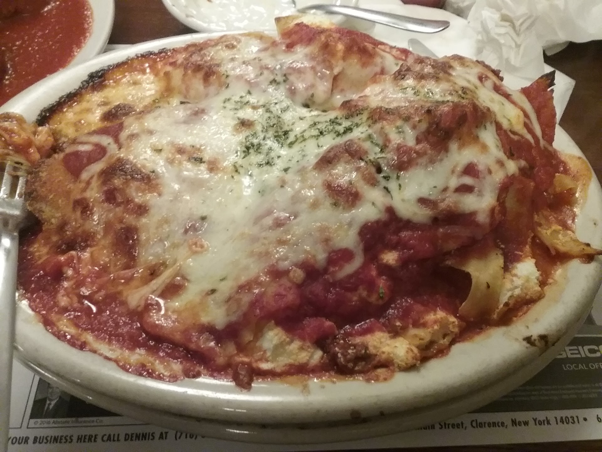 We were recommended to this restaurant by a few people so decided to make the drive for a birthday dinner. This is a simple place. Clean with a ton of staff. Some of the waitresses seemed very personable with the customers. Ours was hurried and put off. My husband was still talking and she walked away. Our food did come quickly and hot. The appetizer was some dough with peppers onions and a tough sausage. This came with a side of sauce for dipping. It was o.k. Our next appetizer was garlic bread with mozzarella. It was warm and the cheese was melted on a sub roll. No color on the cheese. But it was tasty. We ordered the combo platter with veal pram, lasagna, and shells. Also came with bread and a salad. The salad was very fresh with olives and garbonzo beans. It was very good. The bread was a sub roll, but it was warm and fresh. They were huge portions, so I tried a bit of each and took the rest home. The sauce was good and the lasagna was tasty. I'm glad it was a meat lasagna. The veal was breaded and tough. Had to really cut into it with a knife. Could not be cut with a fork. See pictures for portions. We each got a side of meatballs. You always have to try the meatballs! They were good. All in all the food was good, and filled you up with two more meals to spare, for home . I was mostly impressed with the cleanliness. I was happy with how clean the staff was, the tables, floor ect. When we were leaving there was a staff member washing off each menu! Did you ever get a dirty menu and weren't hungry anymore? Well , we will return sometime if we're...