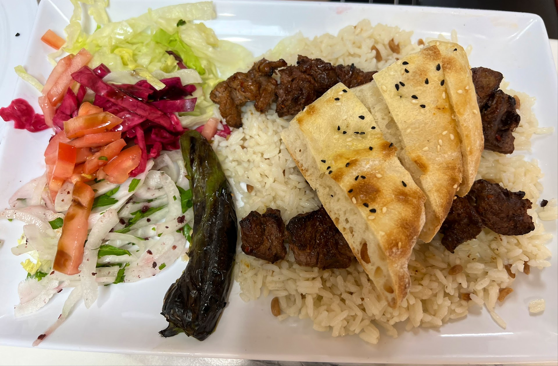 We started with the hummus, which came with warm, fresh bread that was just perfect. The gyro pide was bursting with flavor, and the meat and cheese combination was a real hit. The star of the meal was the mixed grill—every piece of meat was tender, juicy, and packed with flavor. The rice was aromatic and delicious, and the vegetables added the perfect balance to the dish. My wife had the chef’s special, and the meat was unbelievably juicy and tender.