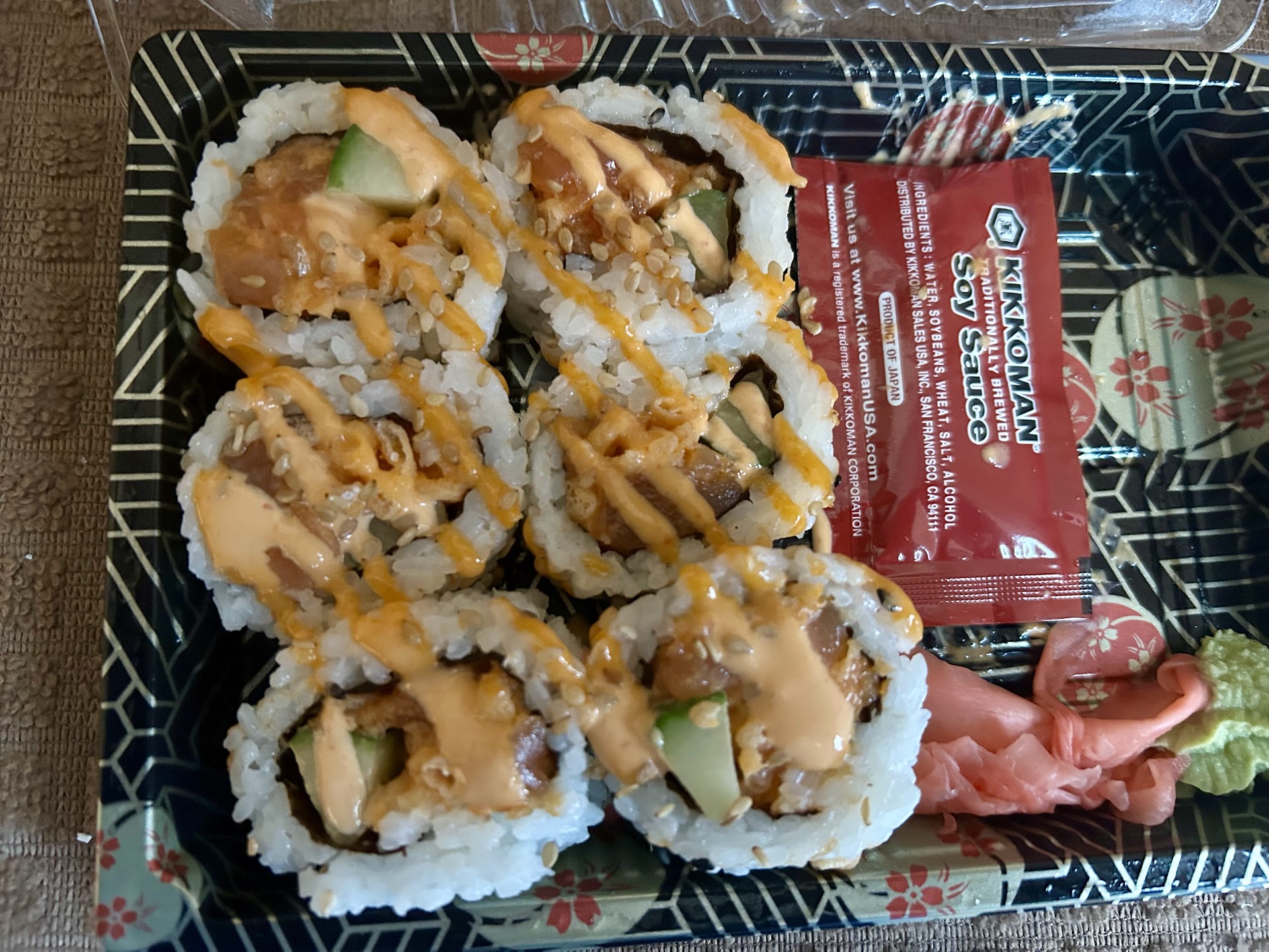 Is it fresh? I believe it to be. But is the quality there? I’m not so sure. I got the “spicy” salmon rolls. The salmon was mushy and a little sus. But I feel fine after eating it, so it might just be really cheap salmon. It also was not even remotely spicy. Not even a little kick. And wasabi comes with all the sushi so I shouldn’t have to add that if you’re gonna call it spicy.