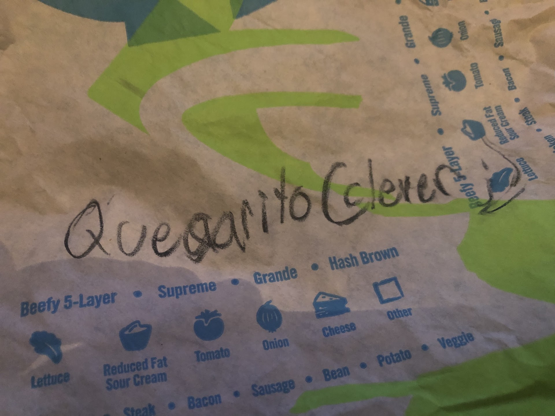 When my food arrives, Iām greeted with my food labeled as pictured (āQuesarito (clever)ā). That employee knew what was up. Not only that, but they went ahead and grilled the burrito like a Quesarito should be.