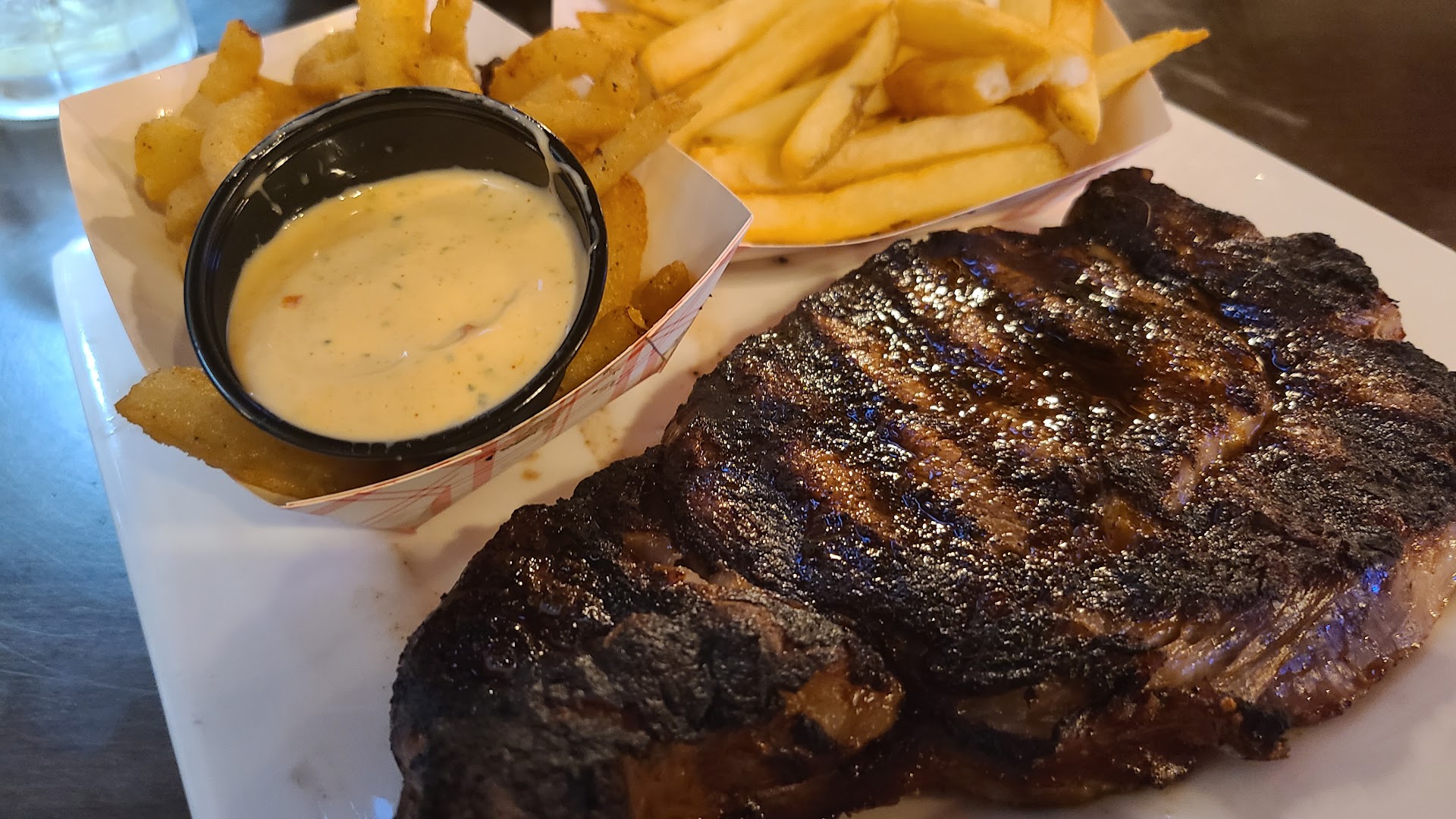 Letās talk about the main attraction. The Ribeye Platter. The side choices I went with are the Onion Twigs and French Fries. Natural cut fries are the way to go all day every day. No one can convince me otherwise. The Onion Twigs with dipping sauce was hard to stop eating. The ribeye was cooked to perfection. I love my steak cooked medium, and have been hesitant requesting it cooked this way, as many places donāt know how to temp meat properly. The steak was cooked flawlessly and seasoned with just a little salt, pepper and garlic. The most tender and flavorful ribeye I have ever had at a restaurant. This truly needed nothing else on it, ya donāt mess with perfection.