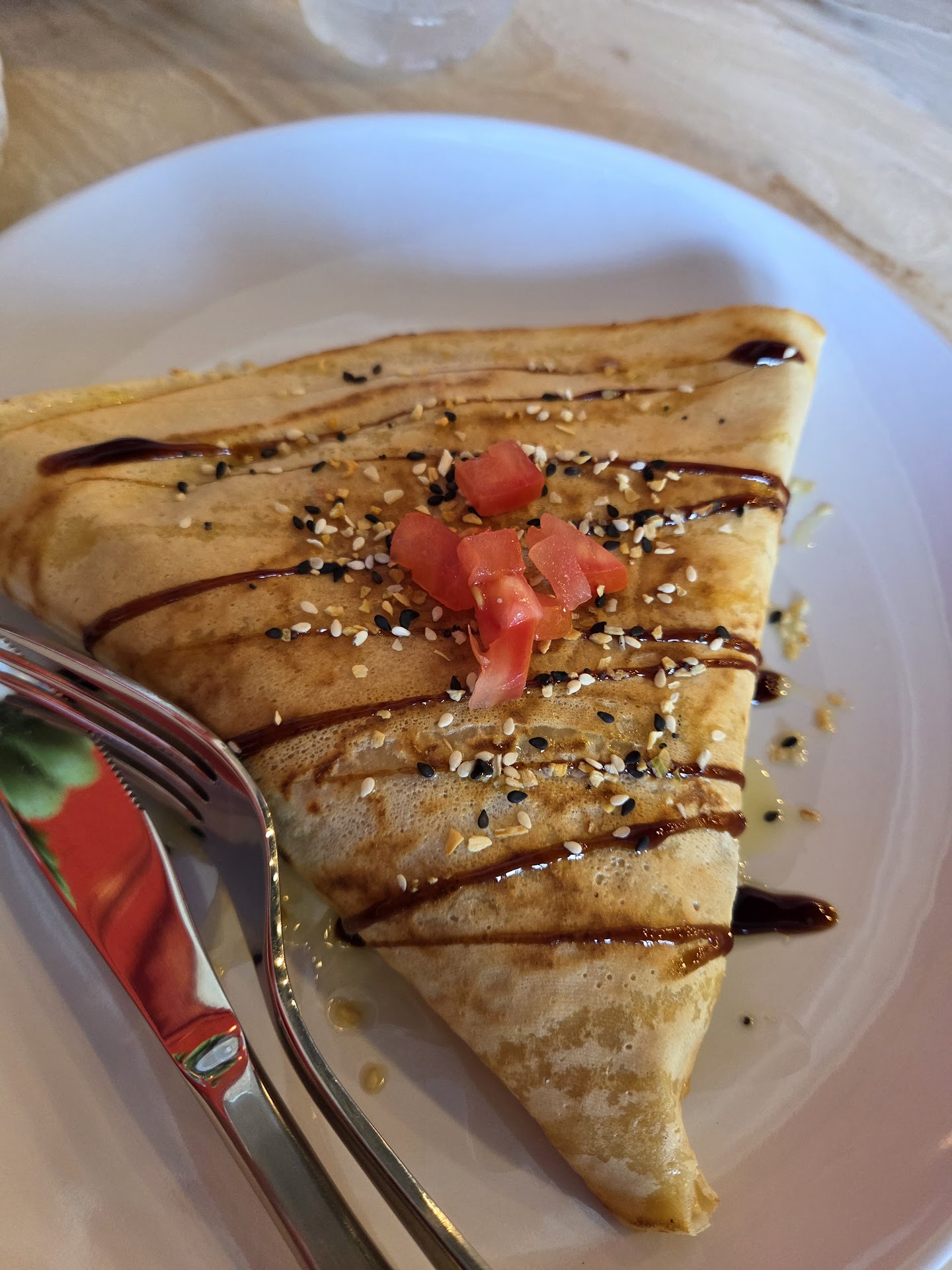 Read moreHubs and I stopped in for date night last night. We didn't know the process of ordering/sitting/etc. and the staff was extremely helpful in guiding us through ordering. They reviewed the menu with us and took our order at the register. We ordered the blazing steak crepe, dulce&banana, and a focaccia pizza. The steak came out first and was so delicious!! Filled with steak, cheese, tomatoes, onions, jalepenos, and topped with a Chipotle. Water required to recover from this one, but the flavor was 10/10. 2nd was the dulce & banana. This was topped with cinnamon and also SO good. The focaccia pizza takes a little longer to cook. However, it is absolutely worth the wait. A focaccia cut in two, topped with a delicious tomato sauce and a slab of mozz. The flavor in the focaccia alone was chefs kiss. On top of the amazing flavors, the staff were so polite and helpful. We...